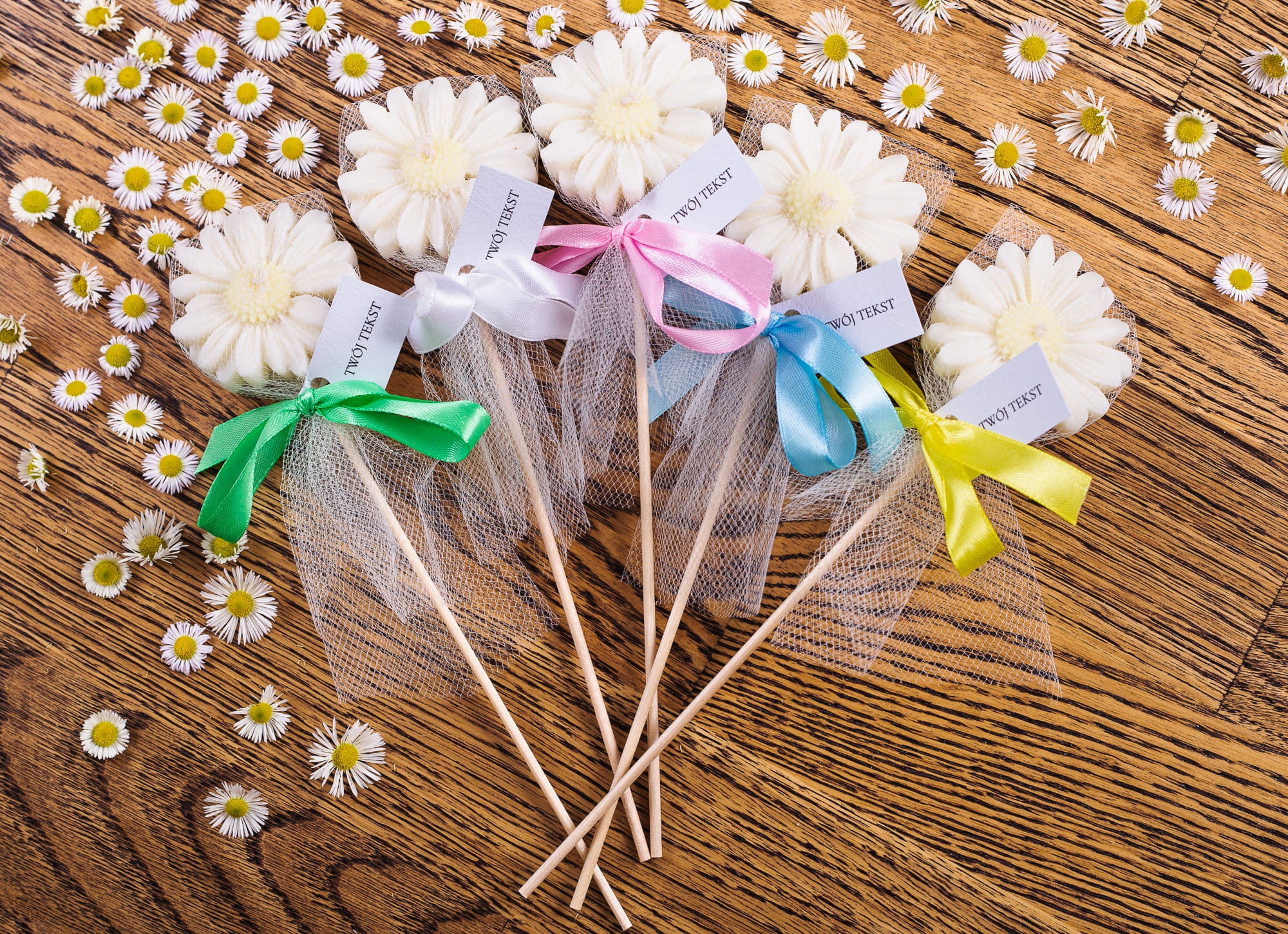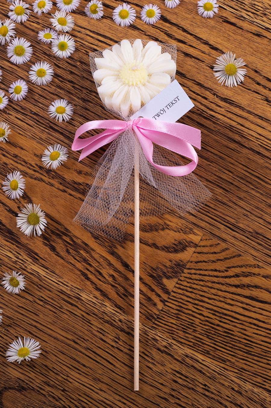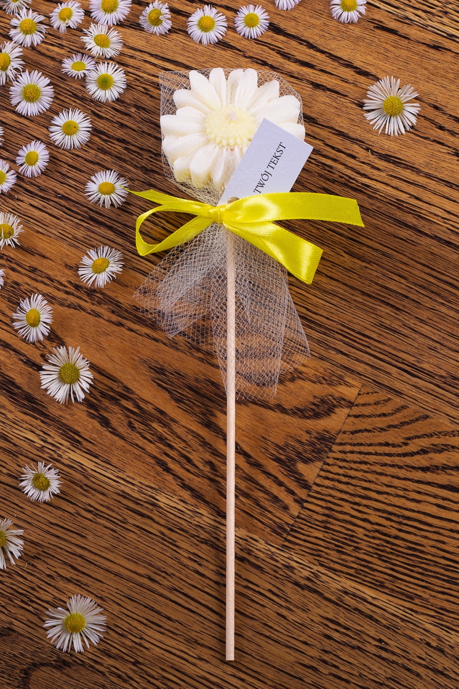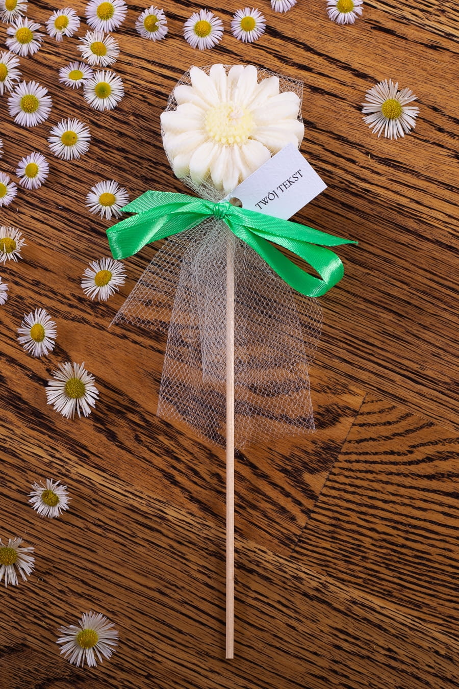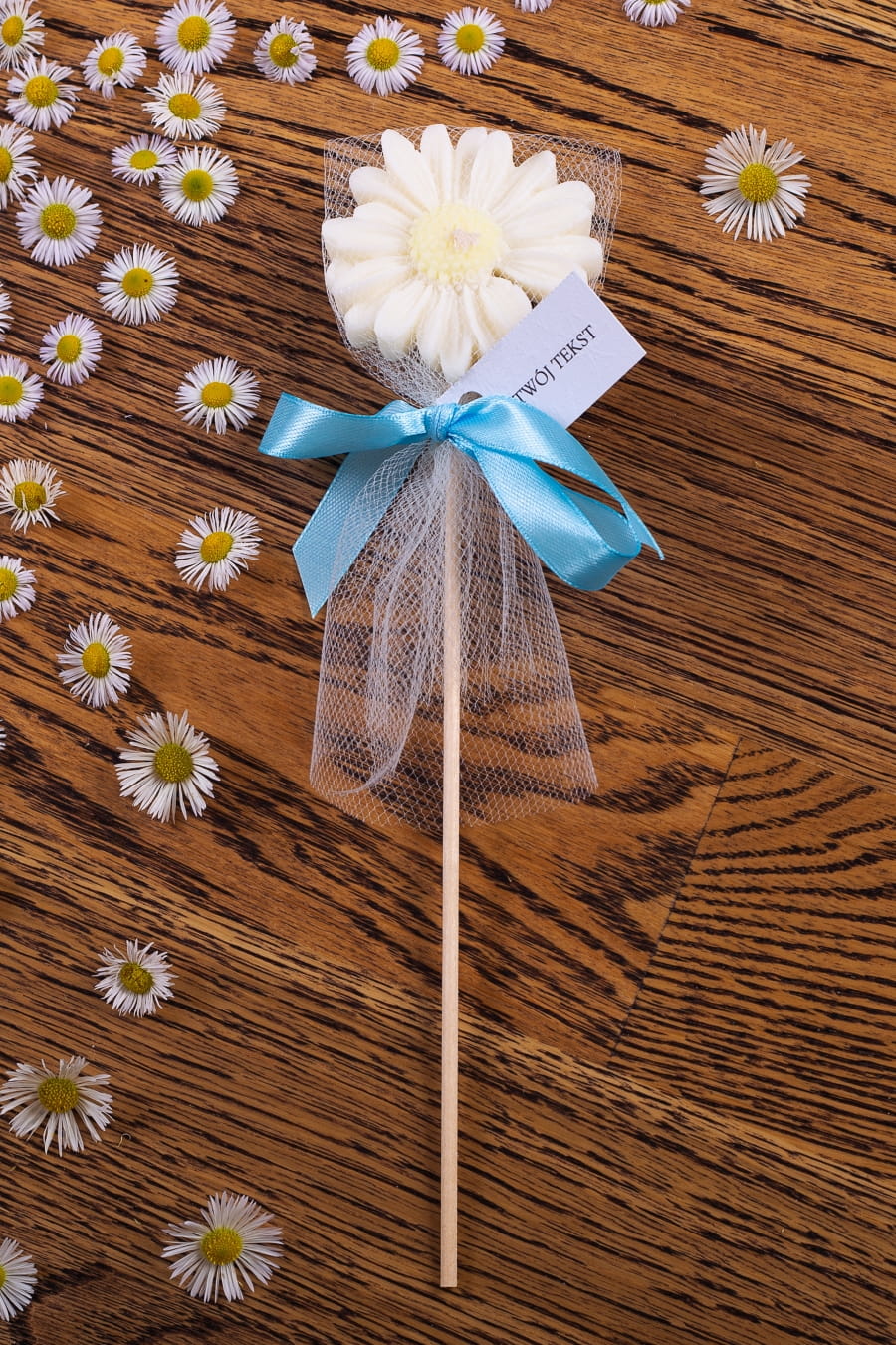 Podziękowania dla gości - biała stokrotka w tiulu na patyczku