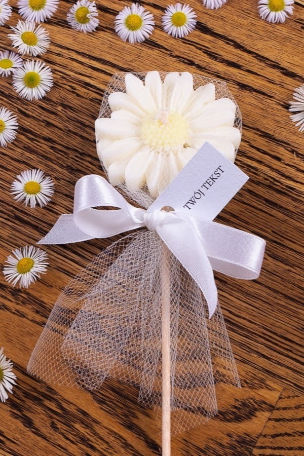 Świeca sojowa "Stokrotka" pakowana w tiul z wstążką oraz personalizowaną winietką
