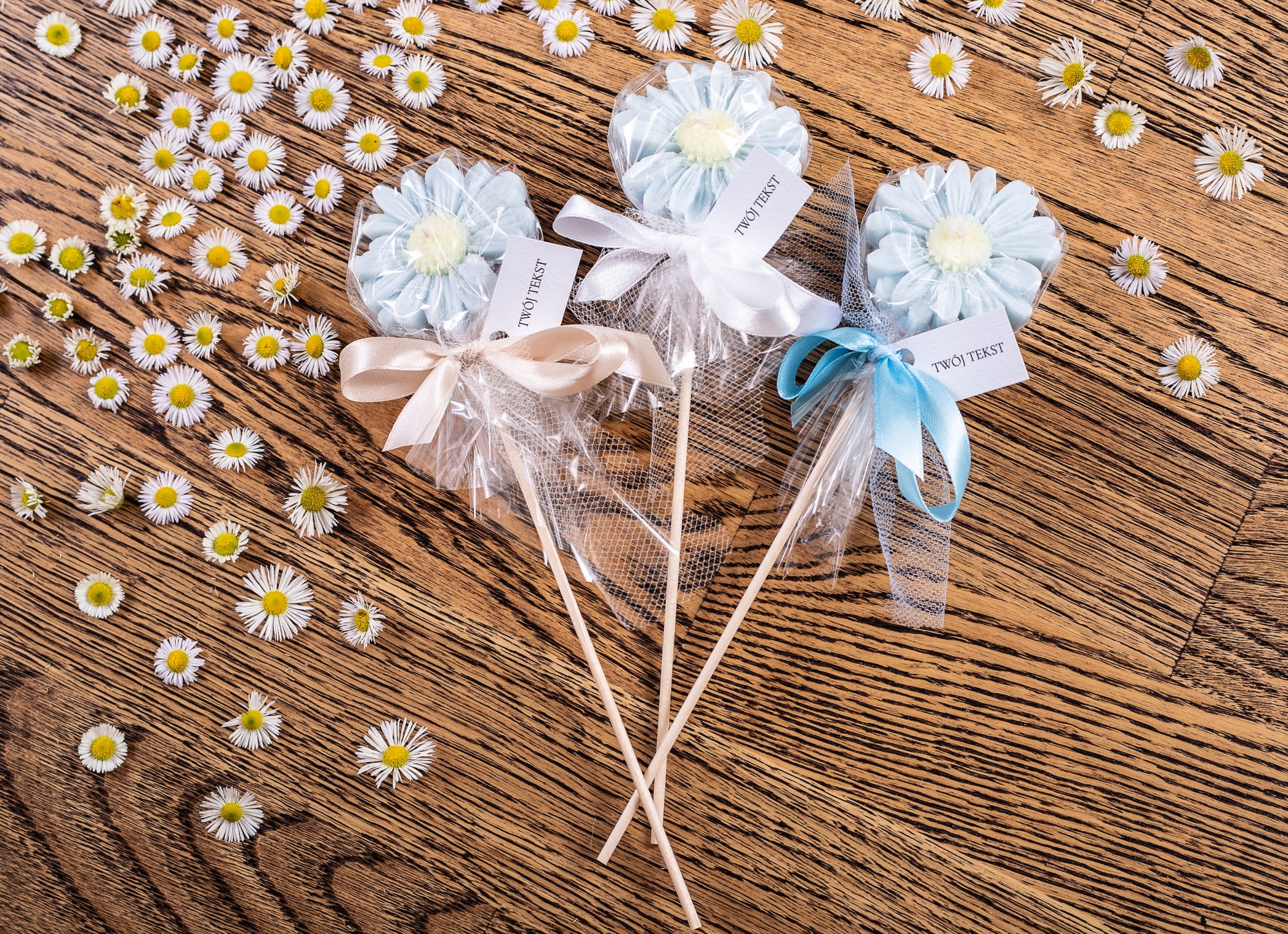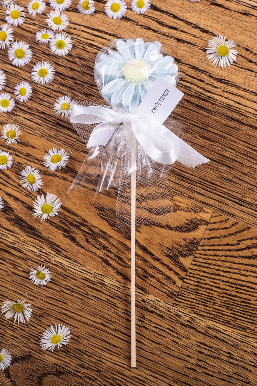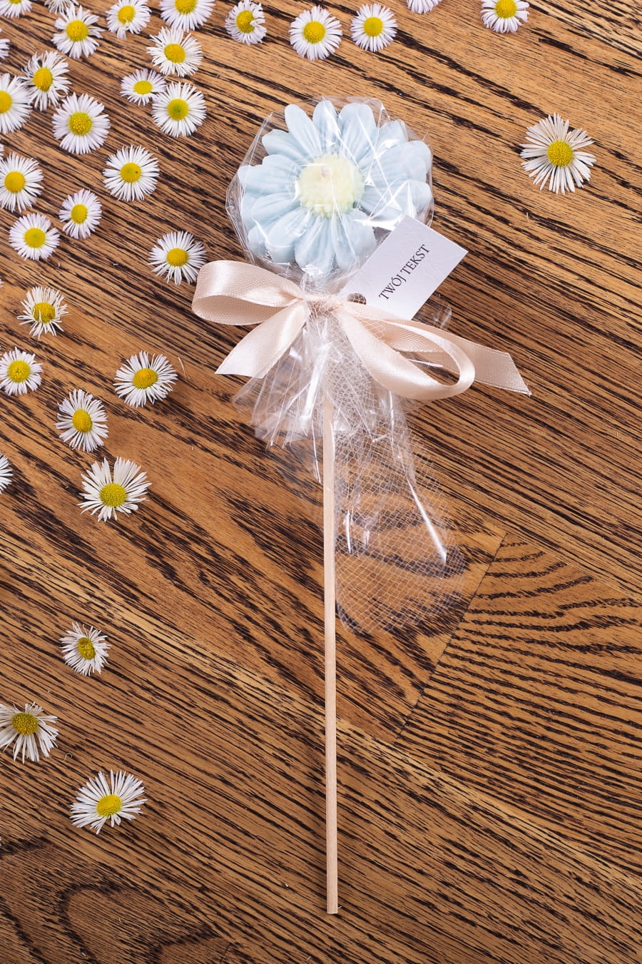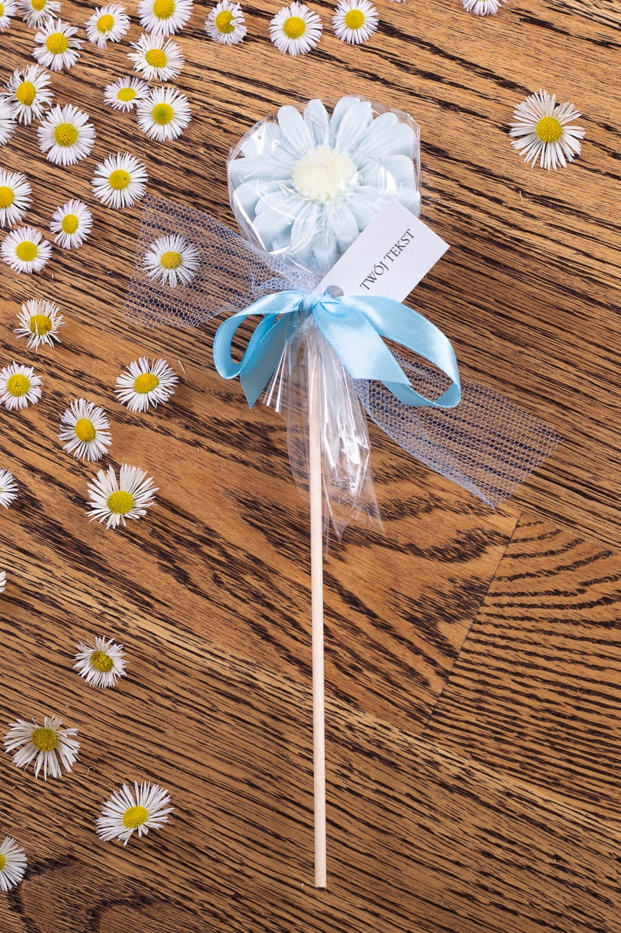 Podziękowania dla gości - błękitna stokrotka w celofanie na patyczku
