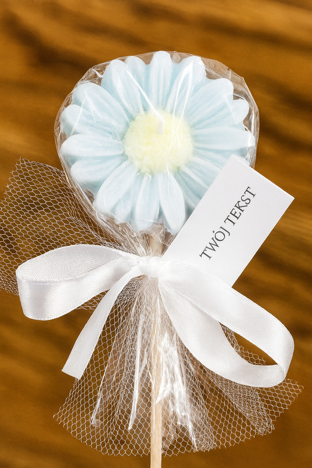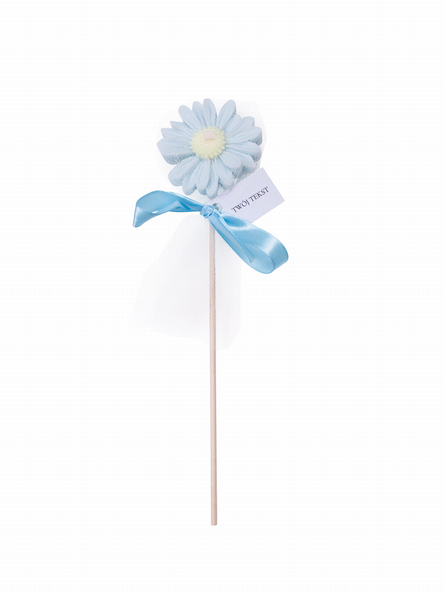 Świeca sojowa "Stokrotka" w kolorze błękitnym pakowana w celofan z wstążką oraz personalizowaną winietką