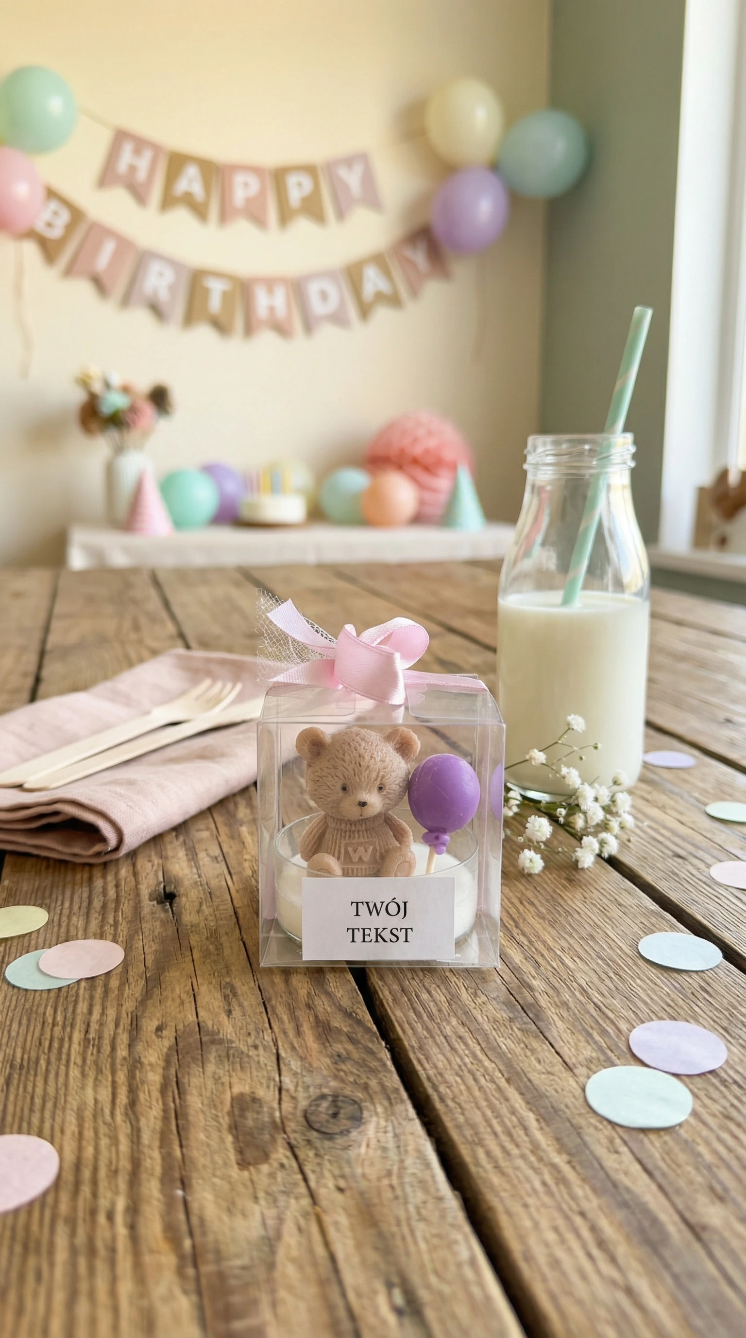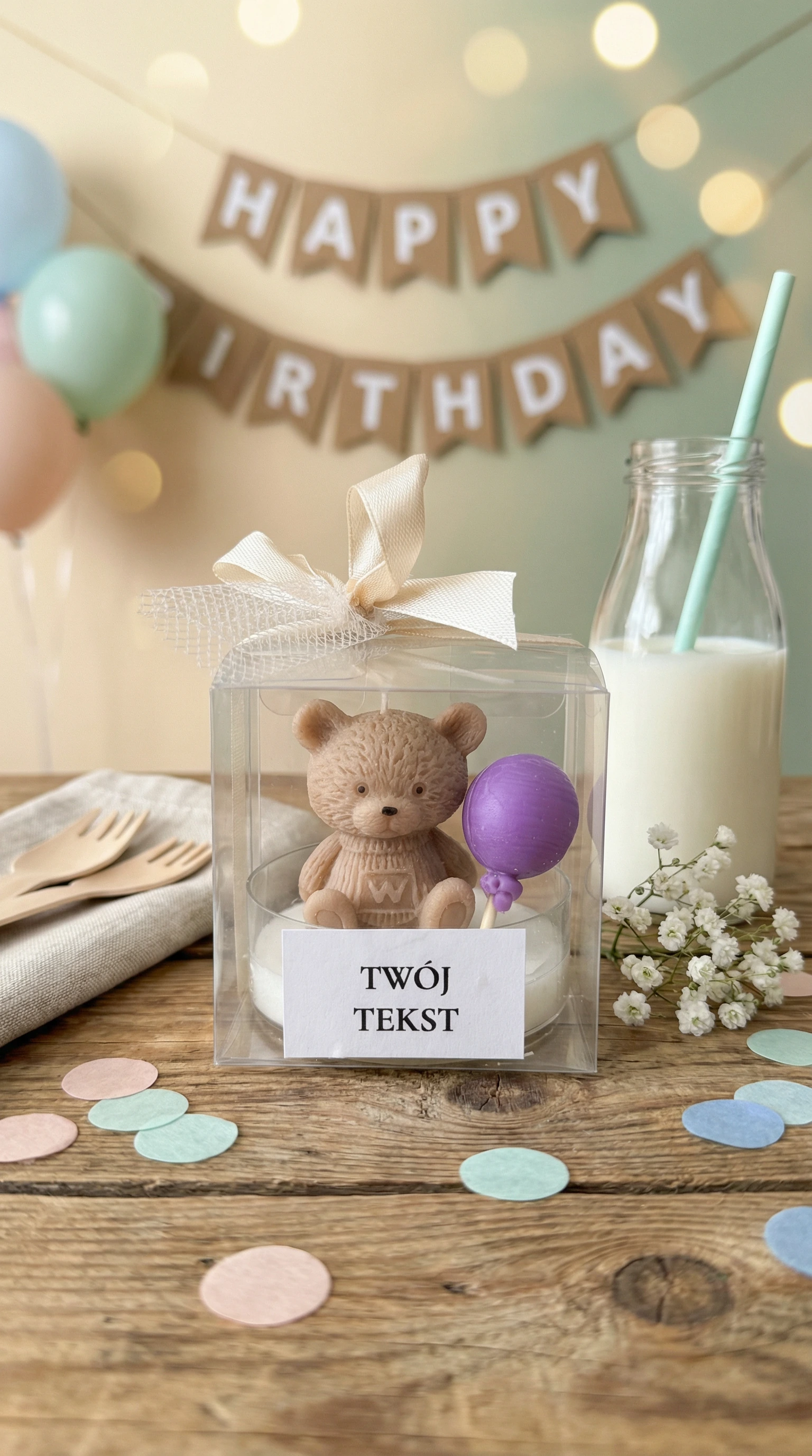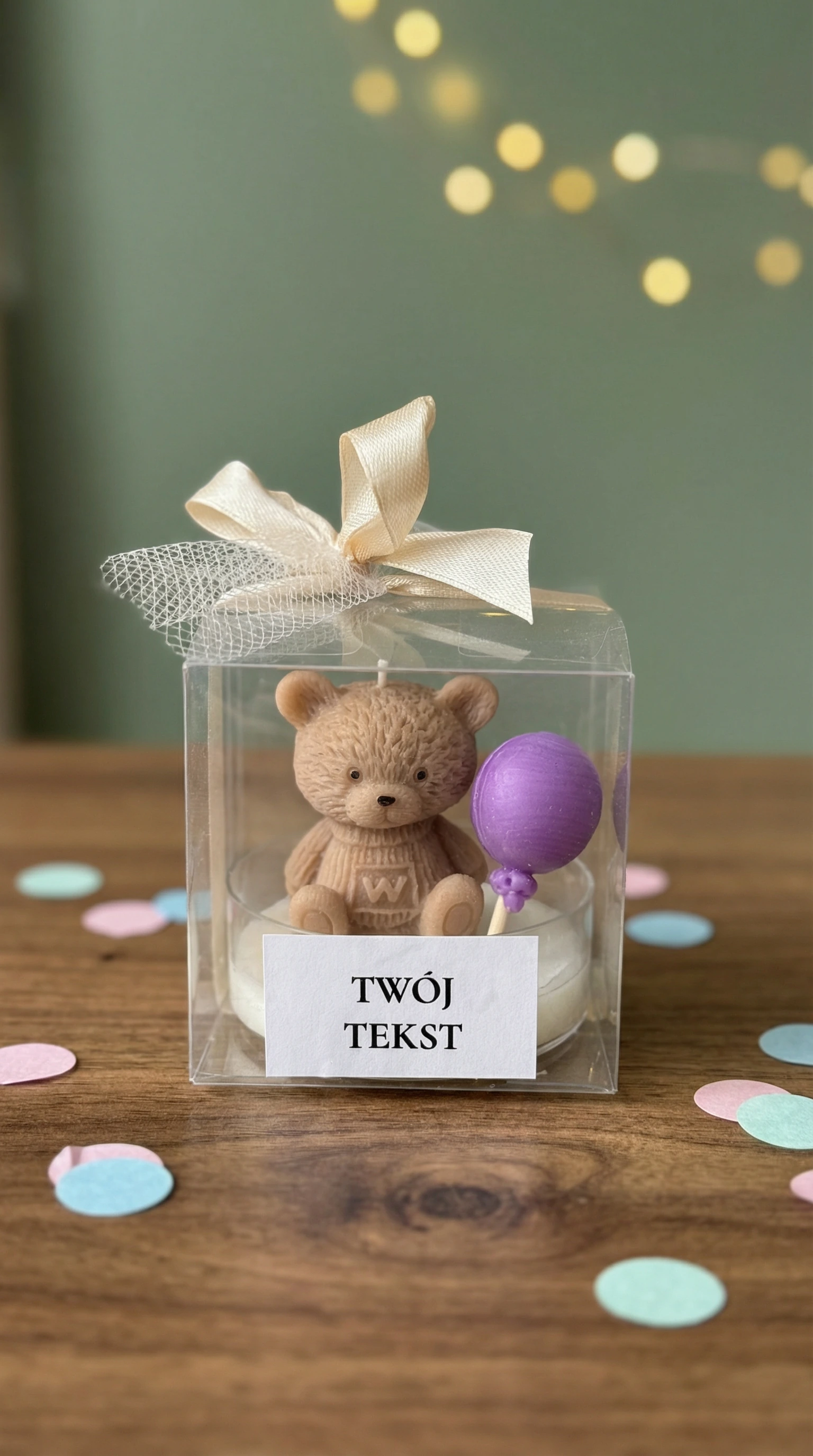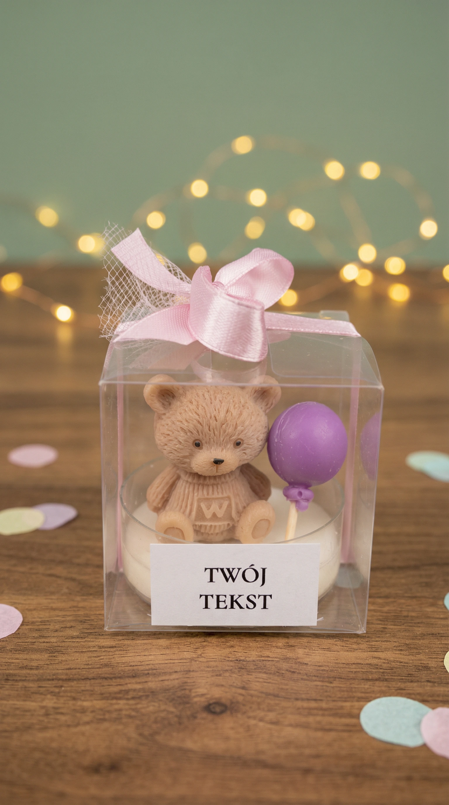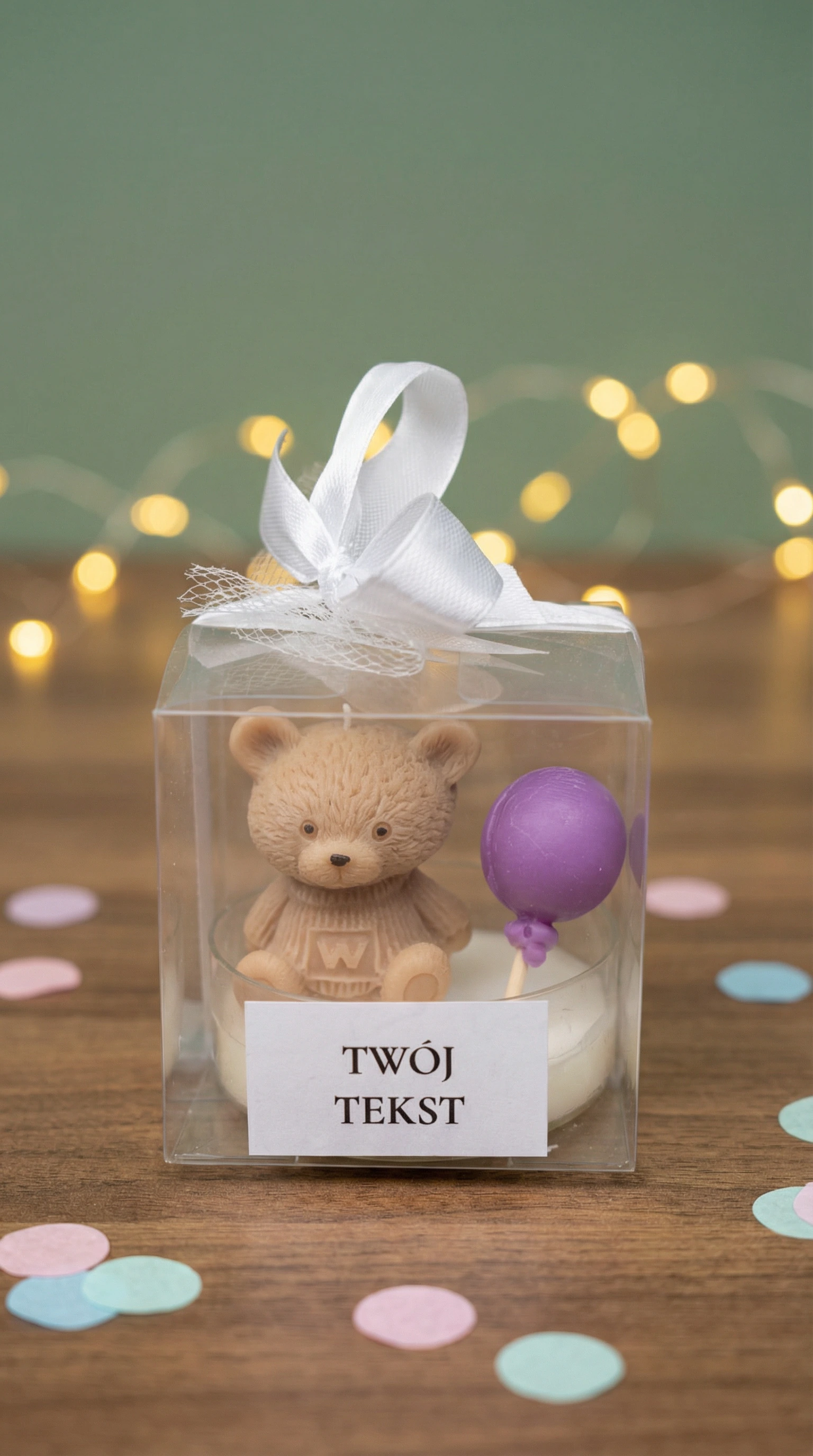 Podziękuj swoim gościom w wyjątkowy sposób – ręcznie robioną świecą sojową z uroczym misiem, zapakowaną w eleganckie pudełeczko z personalizowaną etykietą.