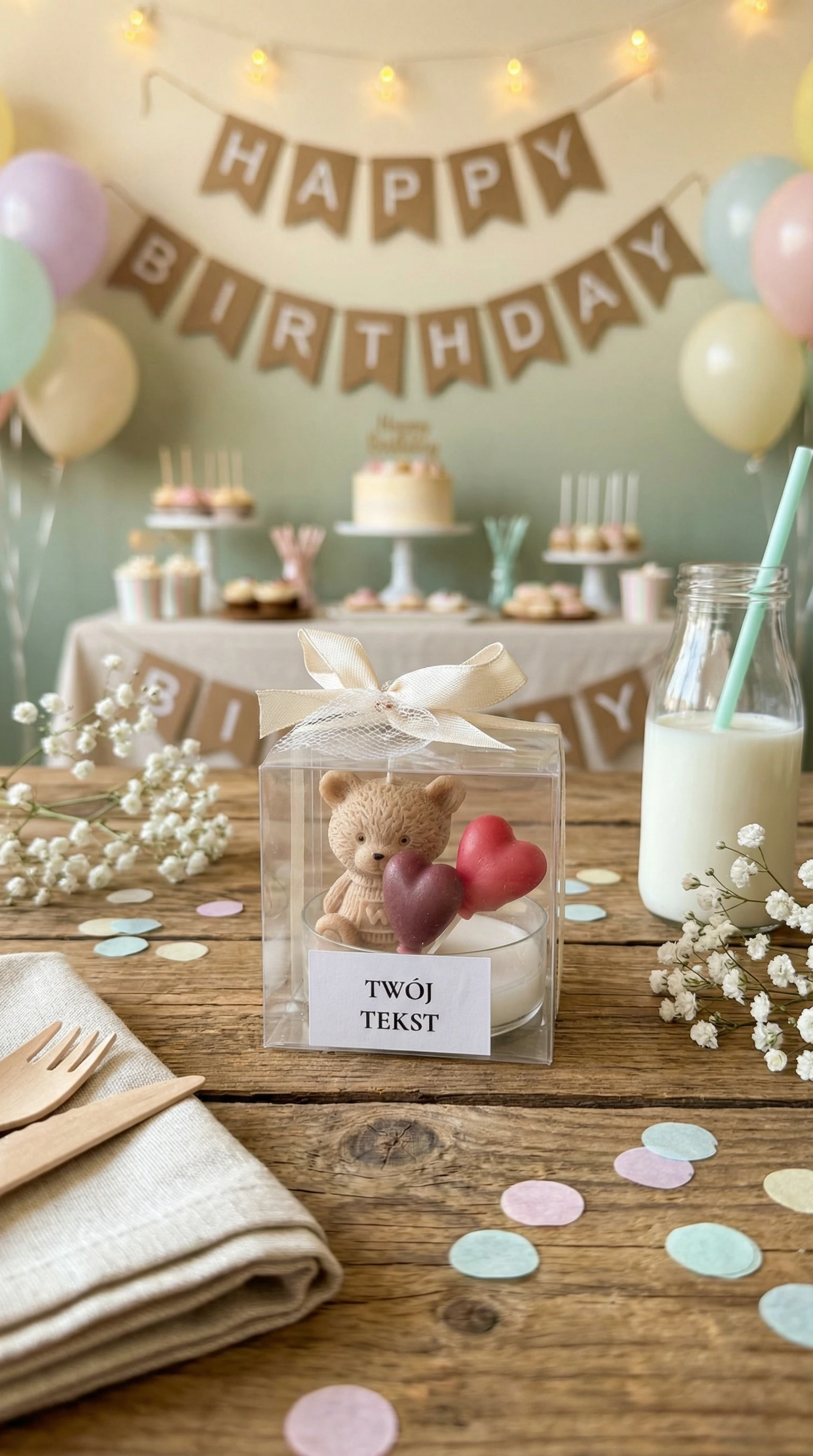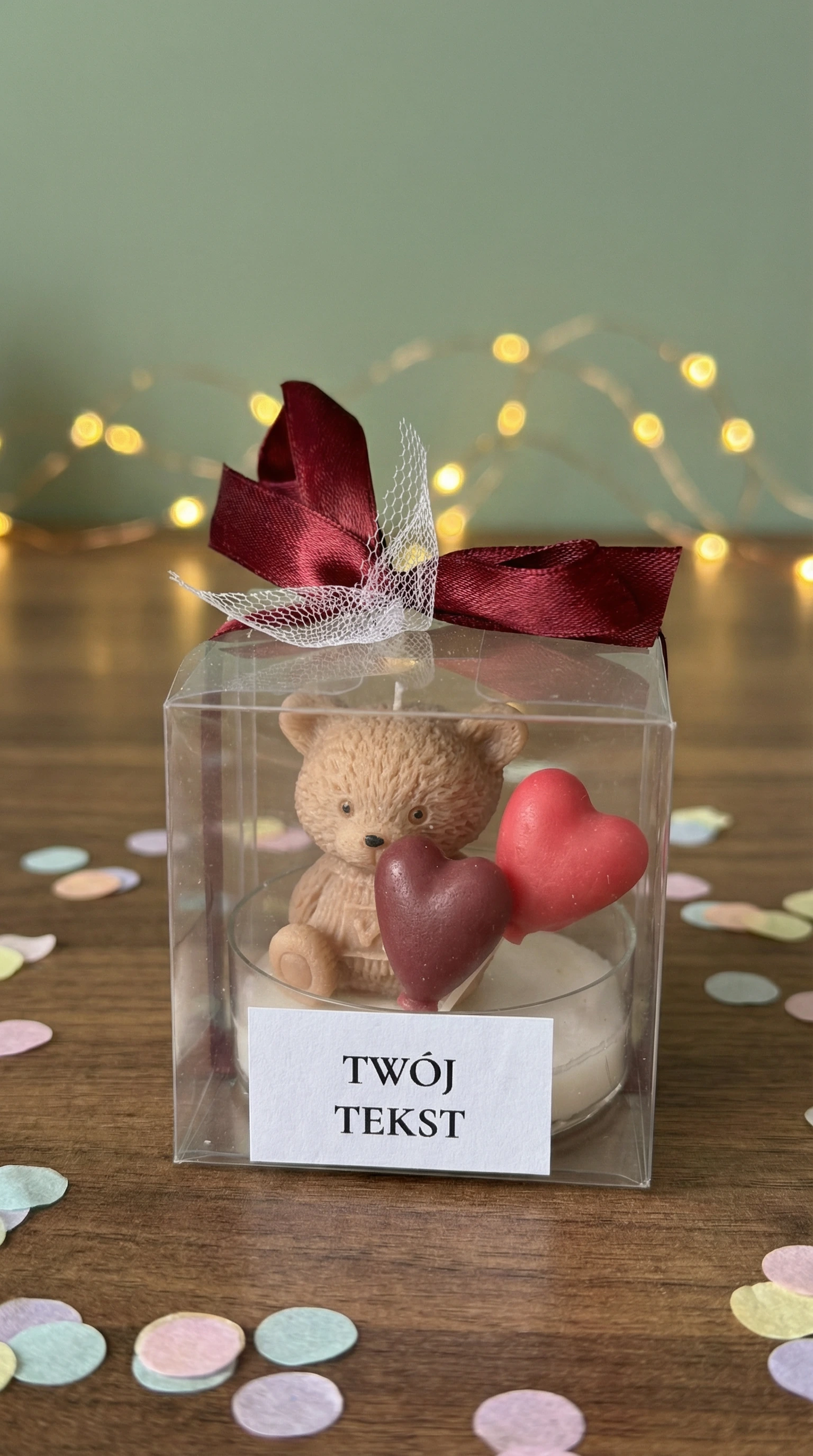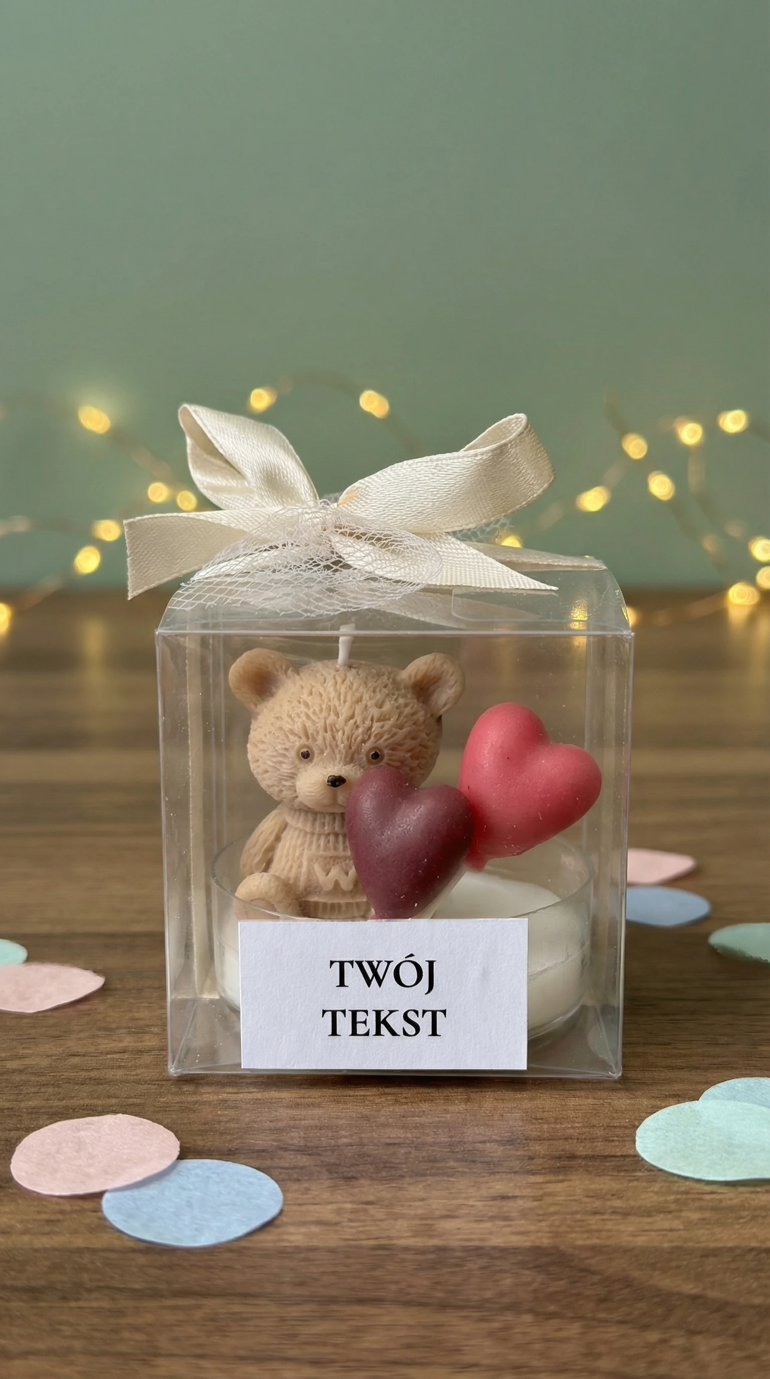 Podziękuj swoim gościom w wyjątkowy sposób – ręcznie robioną świecą sojową z uroczym misiem, zapakowaną w eleganckie pudełeczko z personalizowaną etykietą.