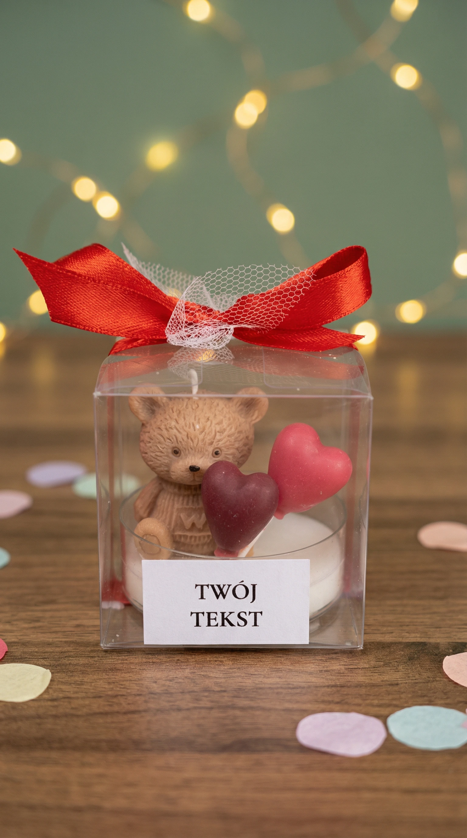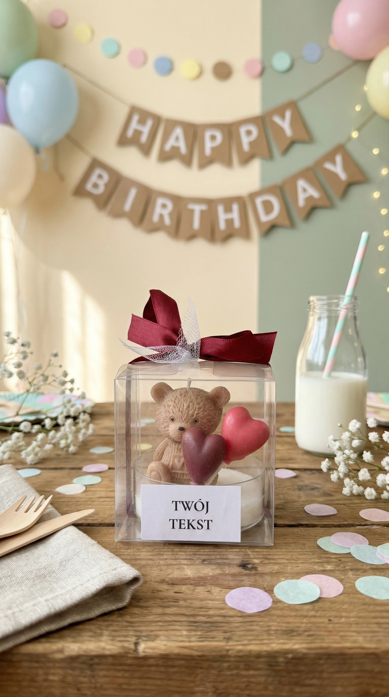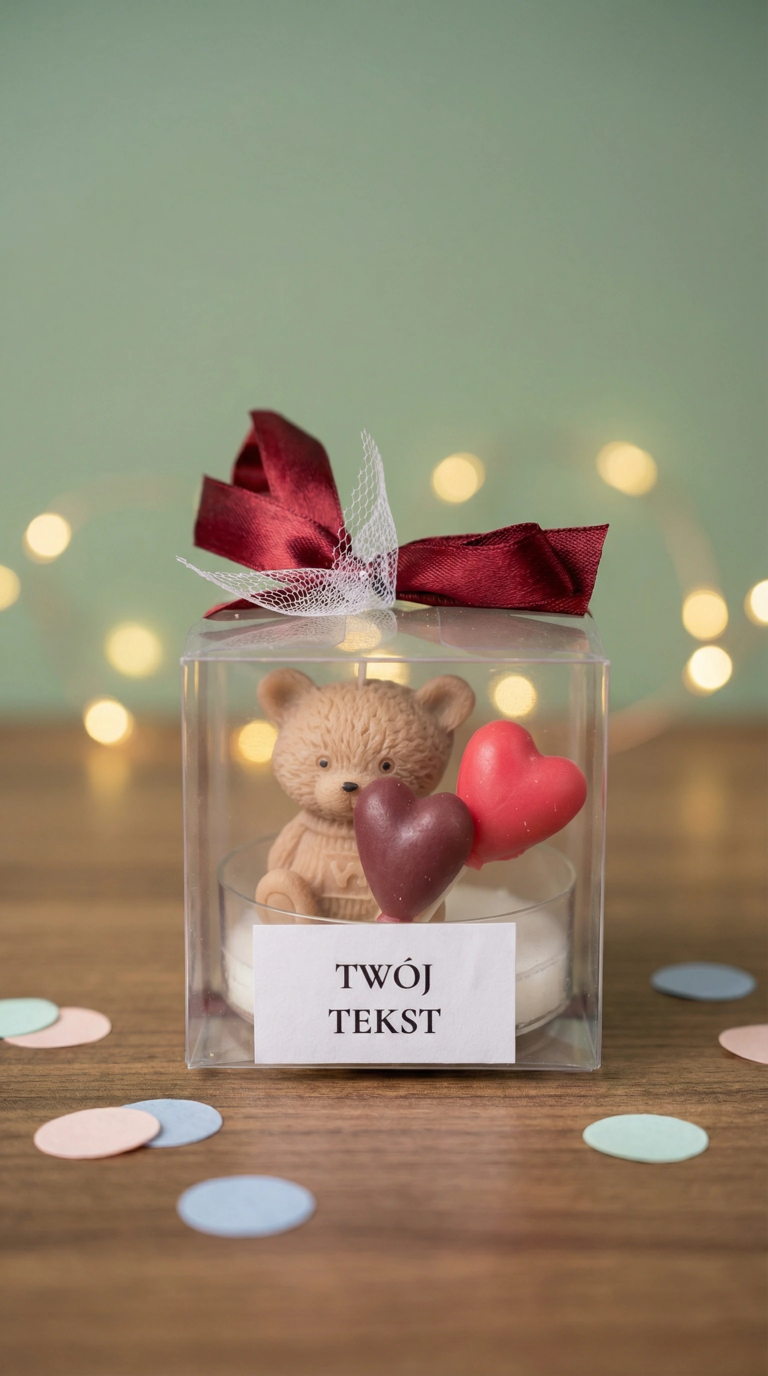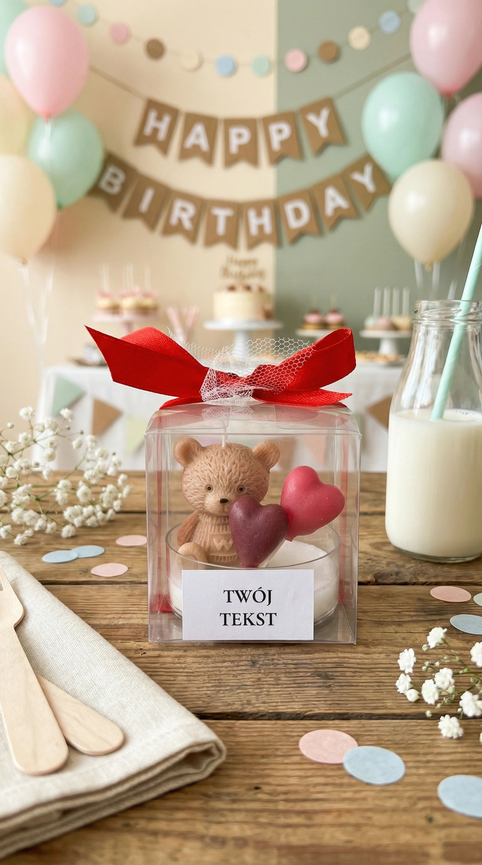Podziękuj swoim gościom w wyjątkowy sposób – ręcznie robioną świecą sojową z uroczym misiem, zapakowaną w eleganckie pudełeczko z personalizowaną etykietą.