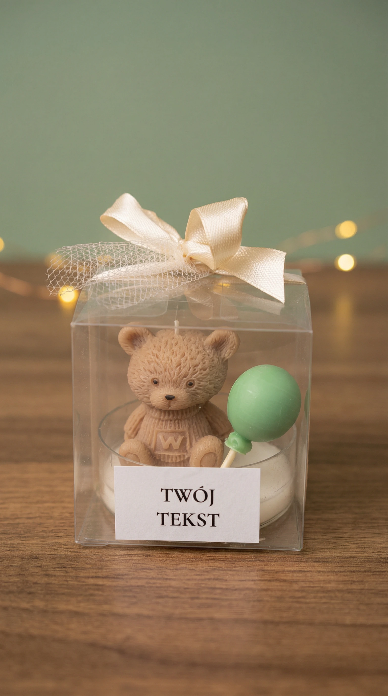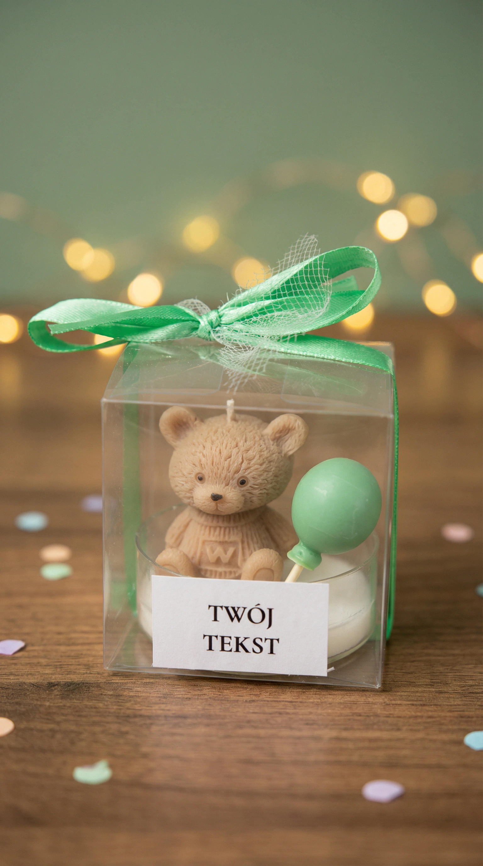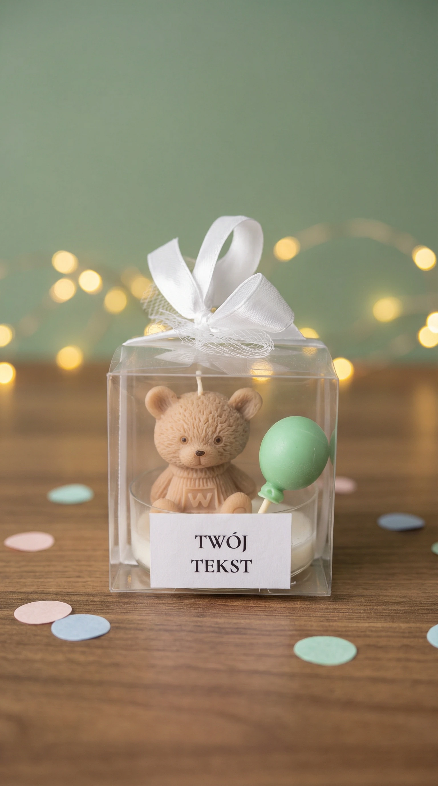 Podziękuj swoim gościom w wyjątkowy sposób – ręcznie robioną świecą sojową z uroczym misiem, zapakowaną w eleganckie pudełeczko z personalizowaną etykietą.