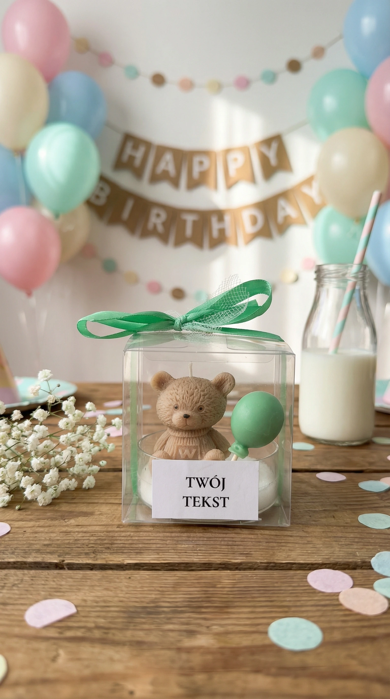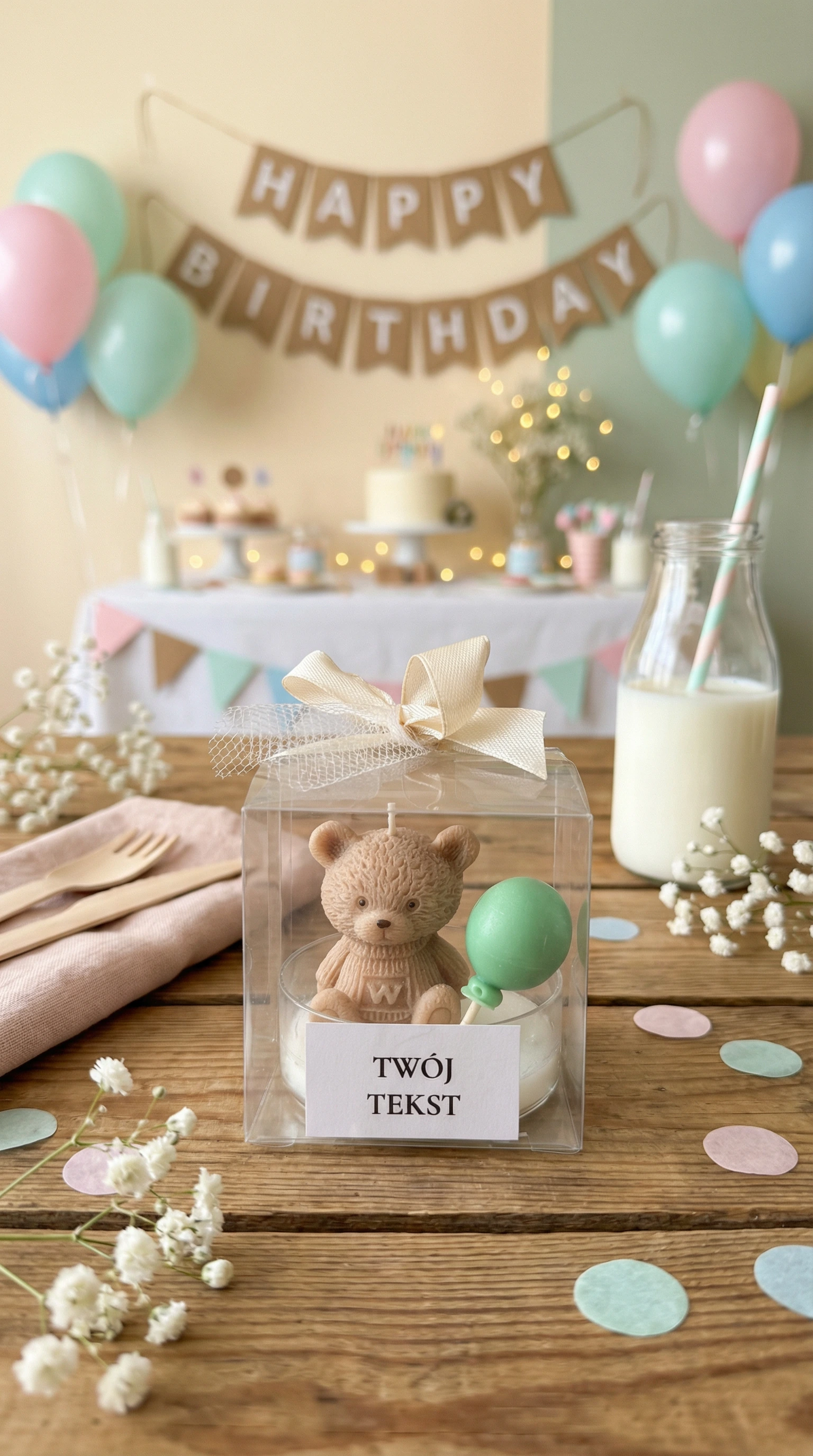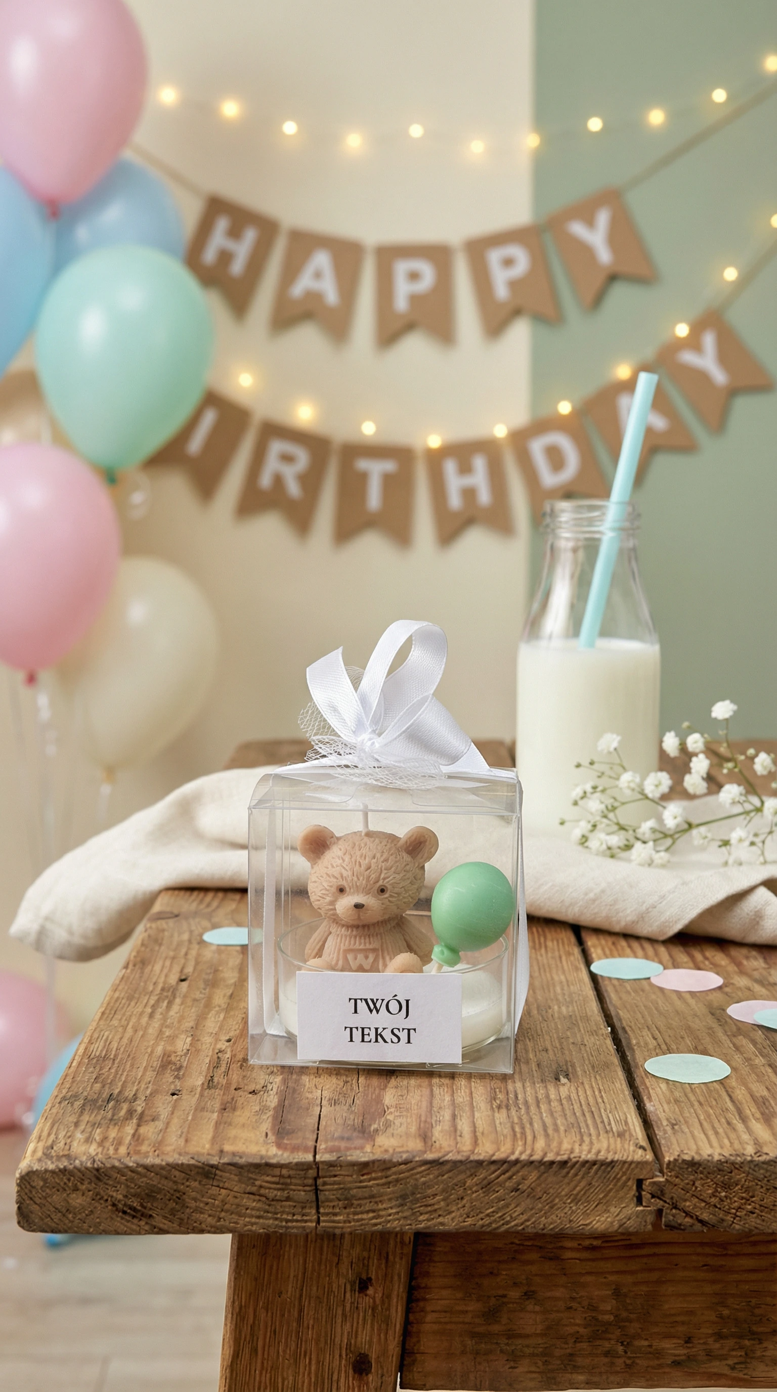 Podziękuj swoim gościom w wyjątkowy sposób – ręcznie robioną świecą sojową z uroczym misiem, zapakowaną w eleganckie pudełeczko z personalizowaną etykietą.