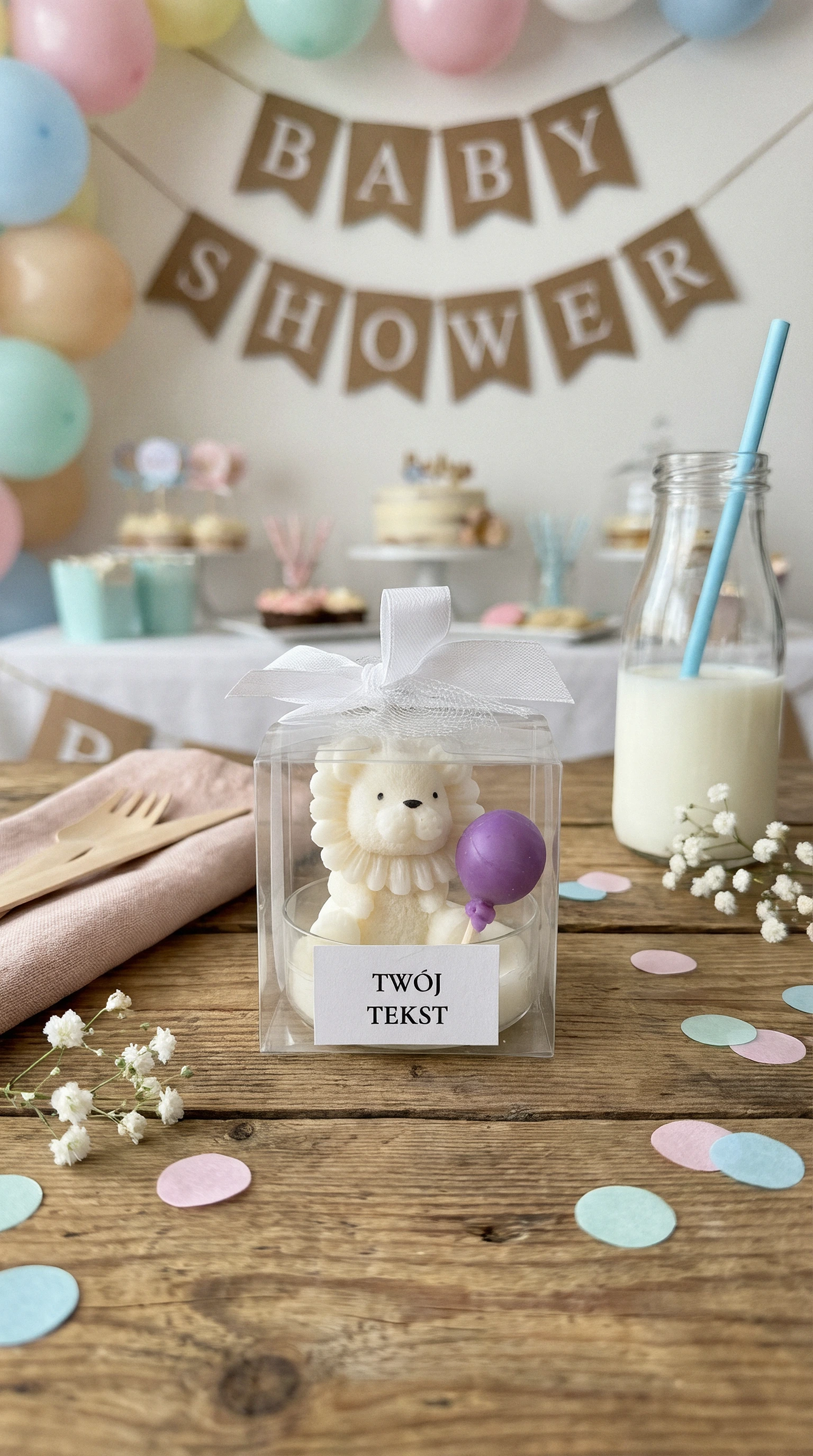 Podziękuj swoim gościom w wyjątkowy sposób – ręcznie robioną świecą sojową z uroczym lewkiem, zapakowaną w eleganckie pudełeczko z personalizowaną etykietą