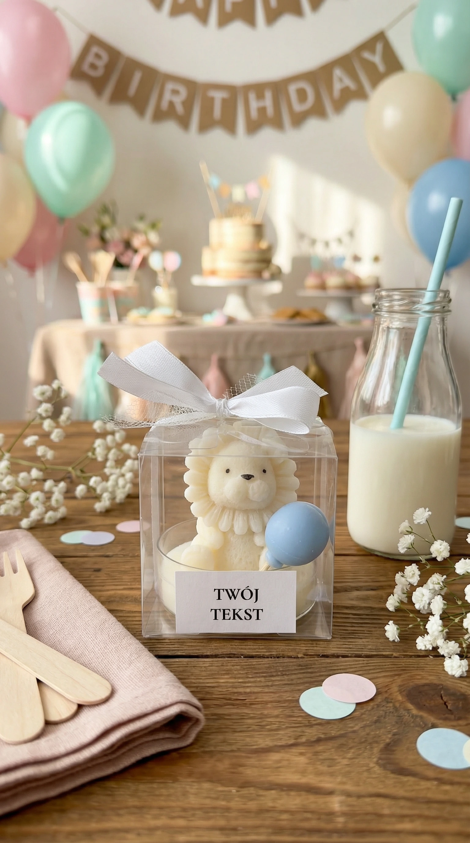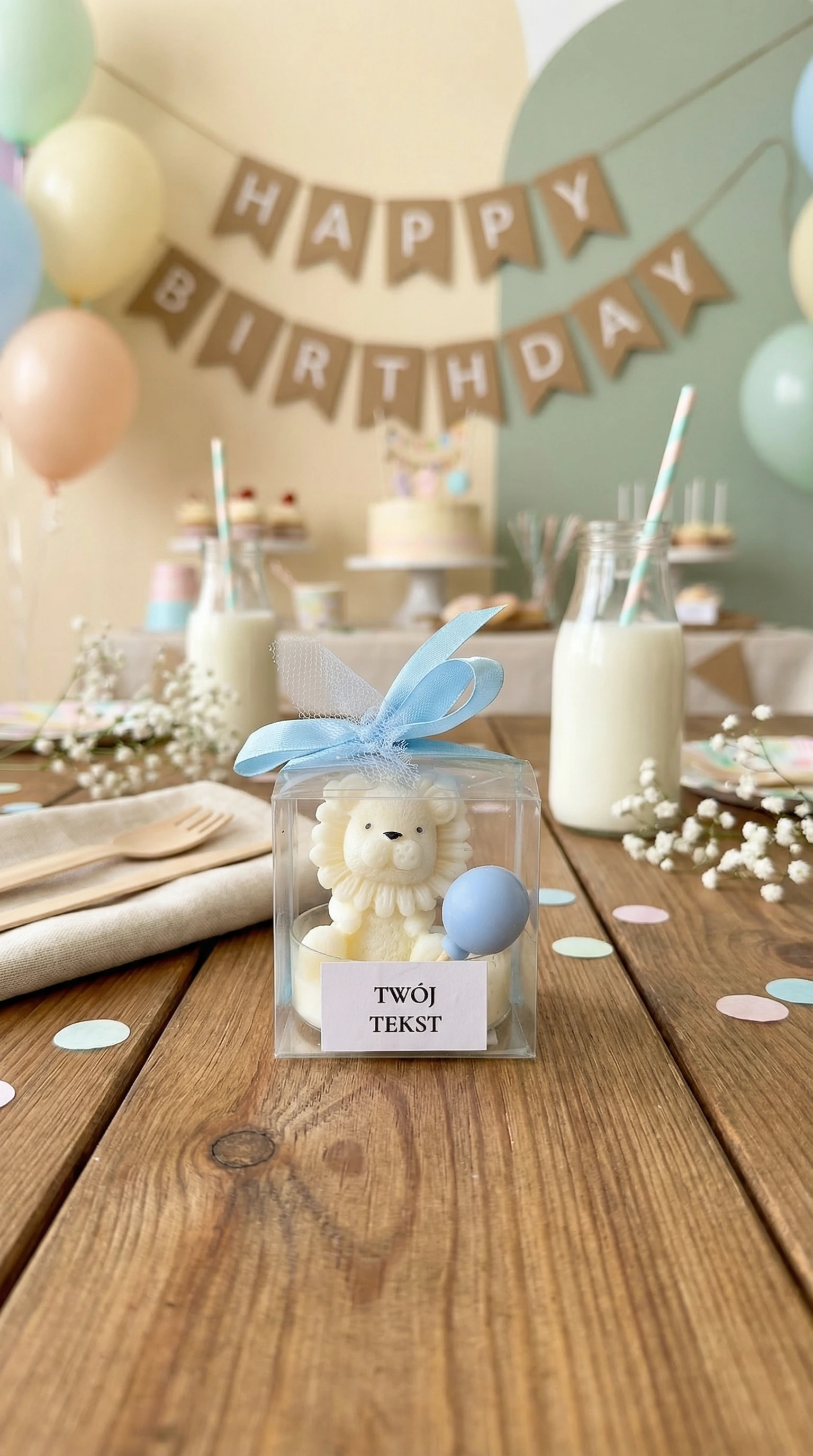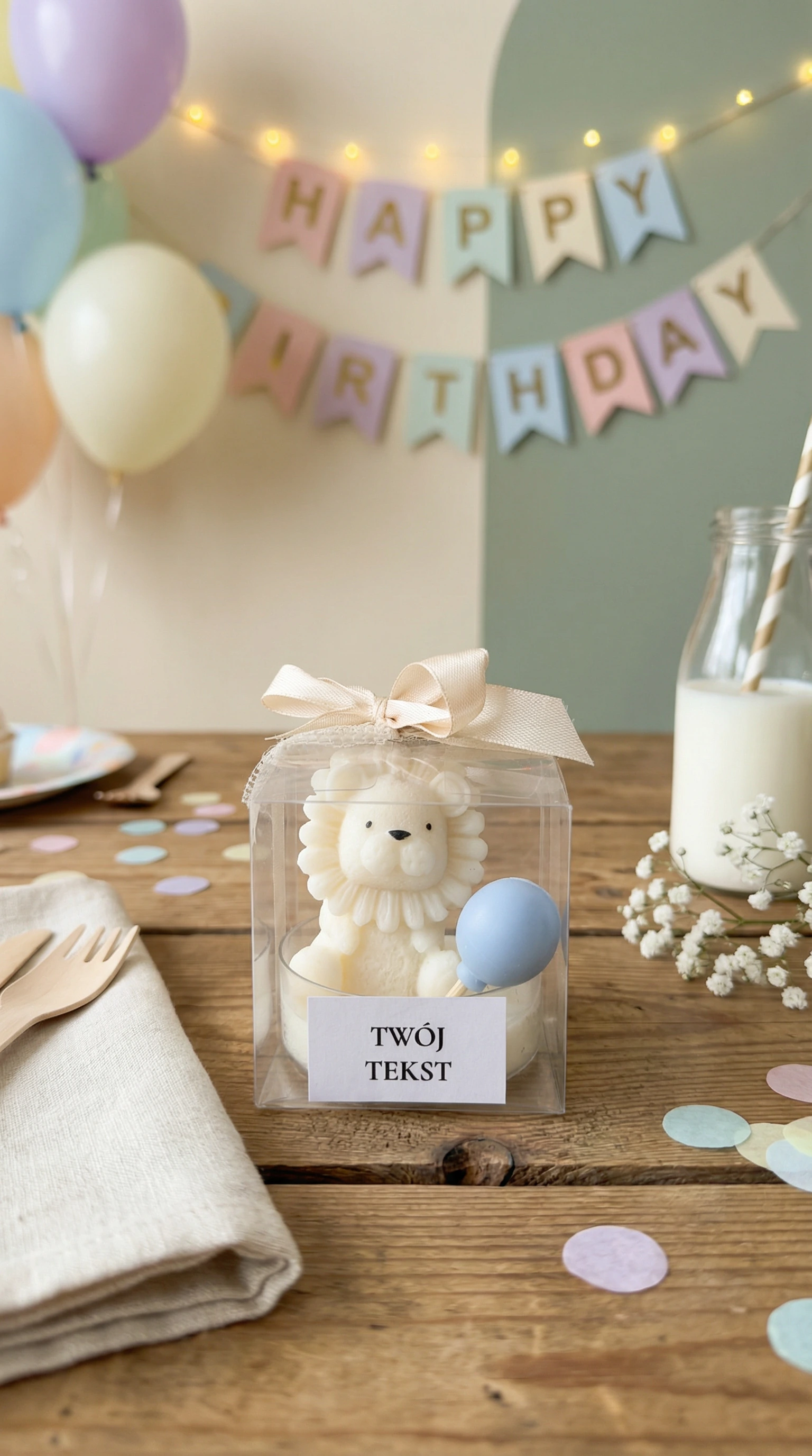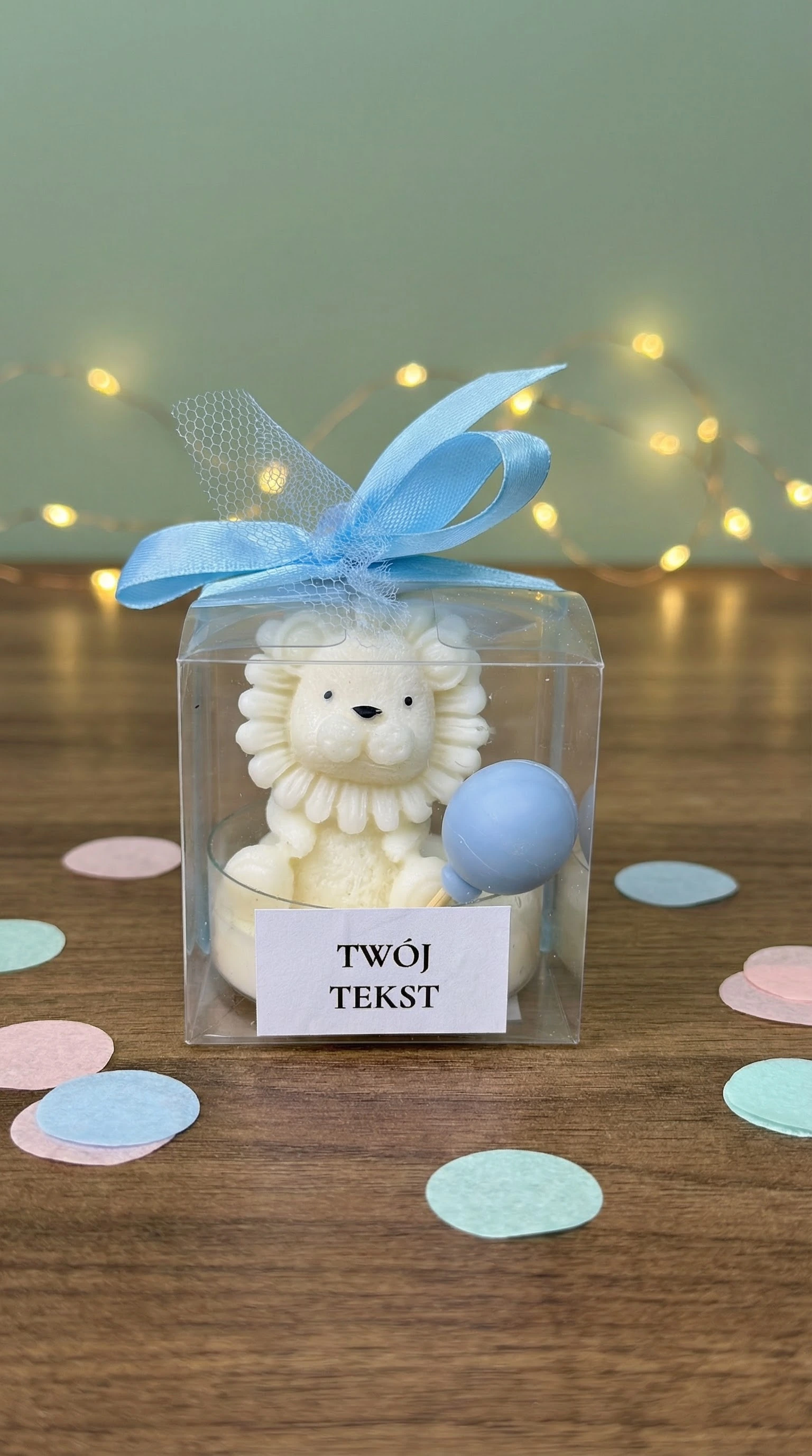 Podziękuj swoim gościom w wyjątkowy sposób – ręcznie robioną świecą sojową z uroczym lewkiem, zapakowaną w eleganckie pudełeczko z personalizowaną etykietą