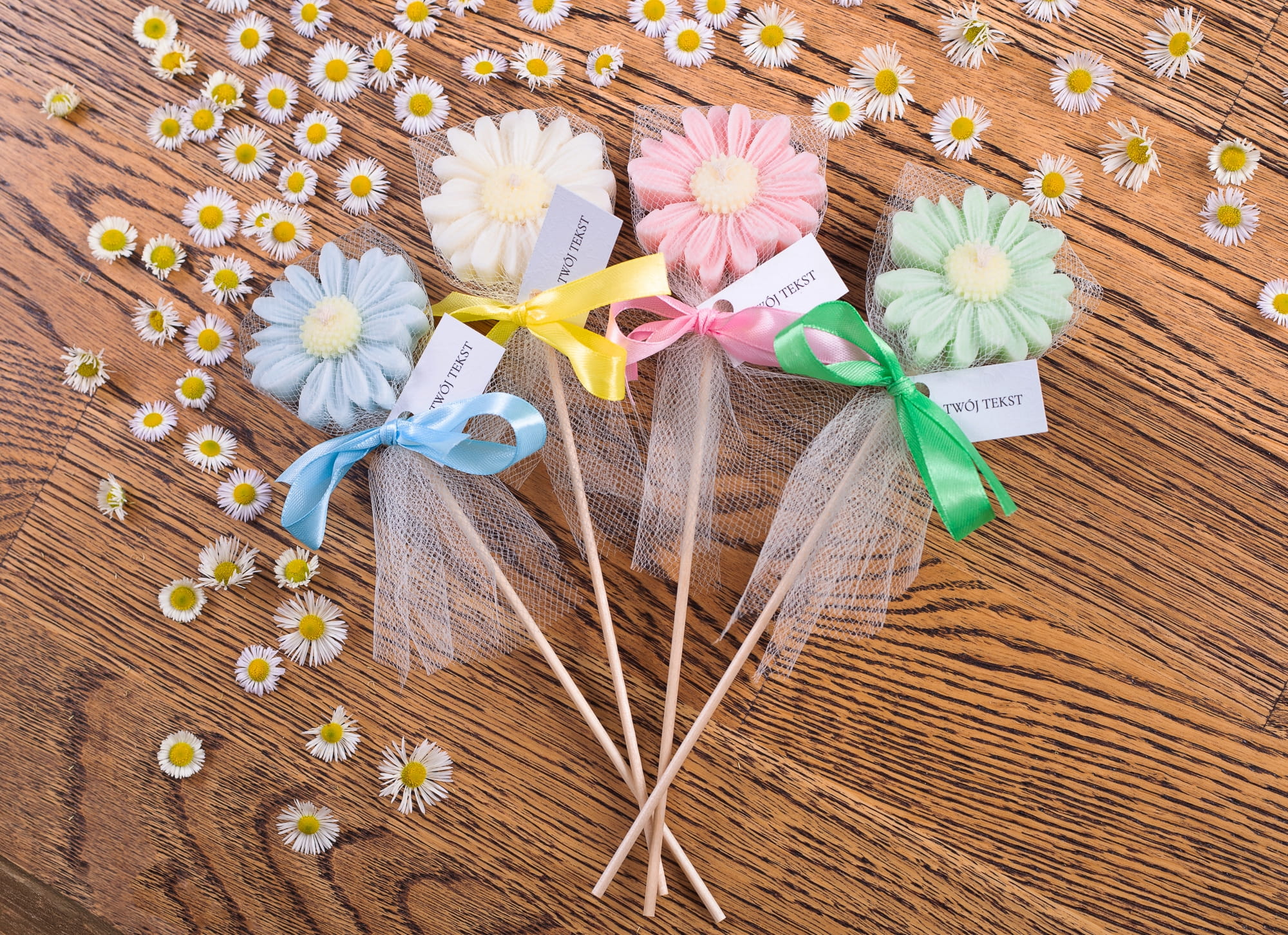 Świeca sojowa "Stokrotka" pakowana w tiul z wstążką oraz personalizowaną winietką