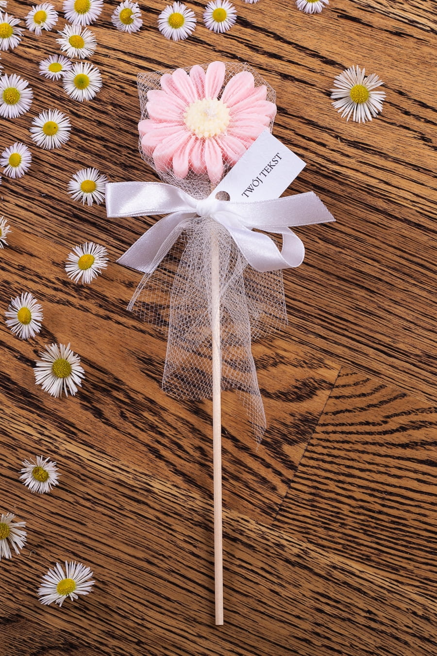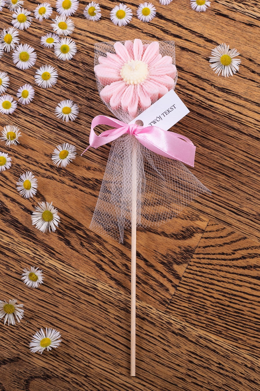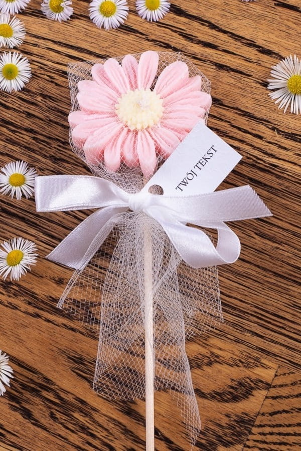 Podziękowania dla gości - różowa stokrotka w tiulu na patyczku