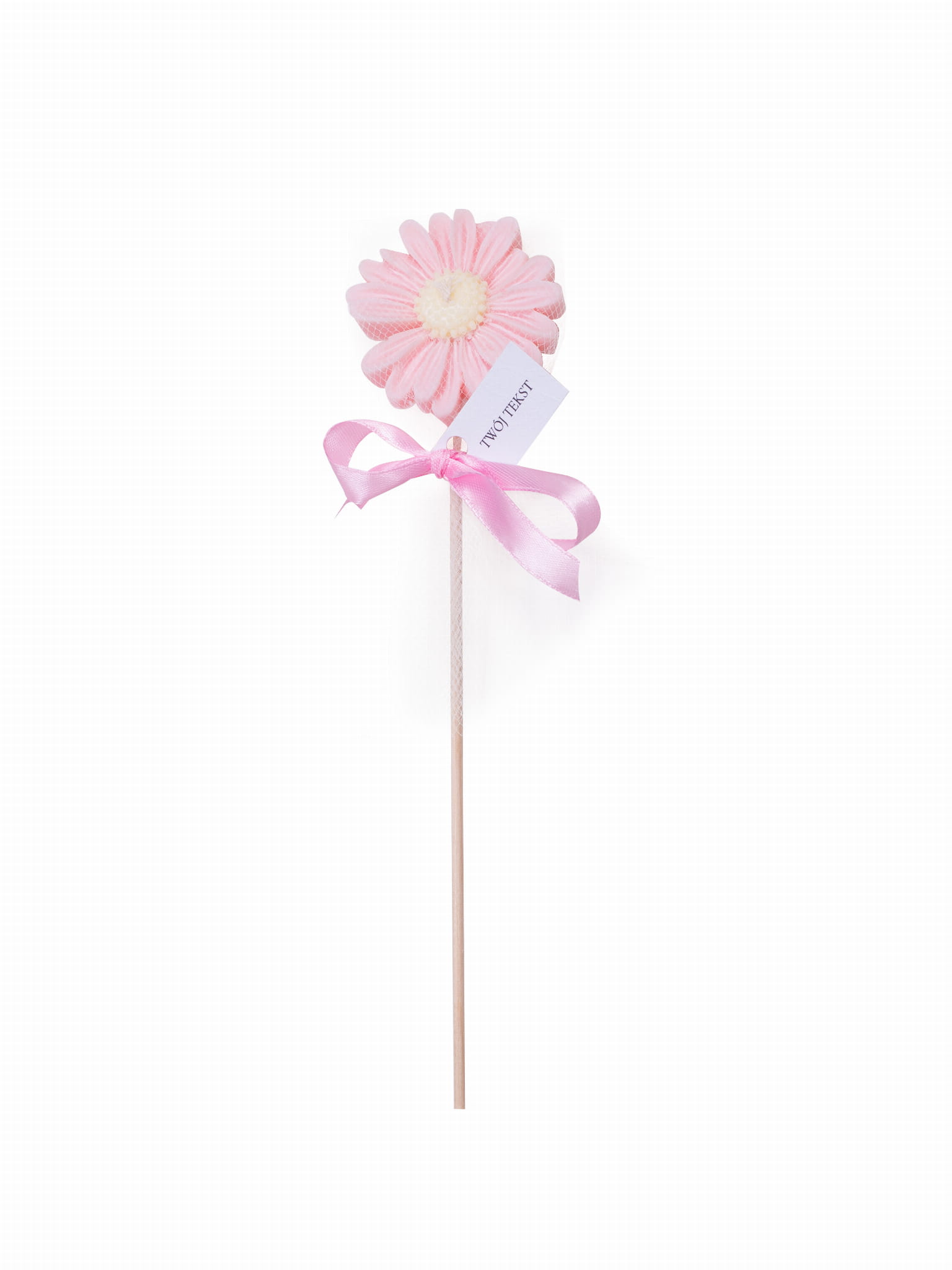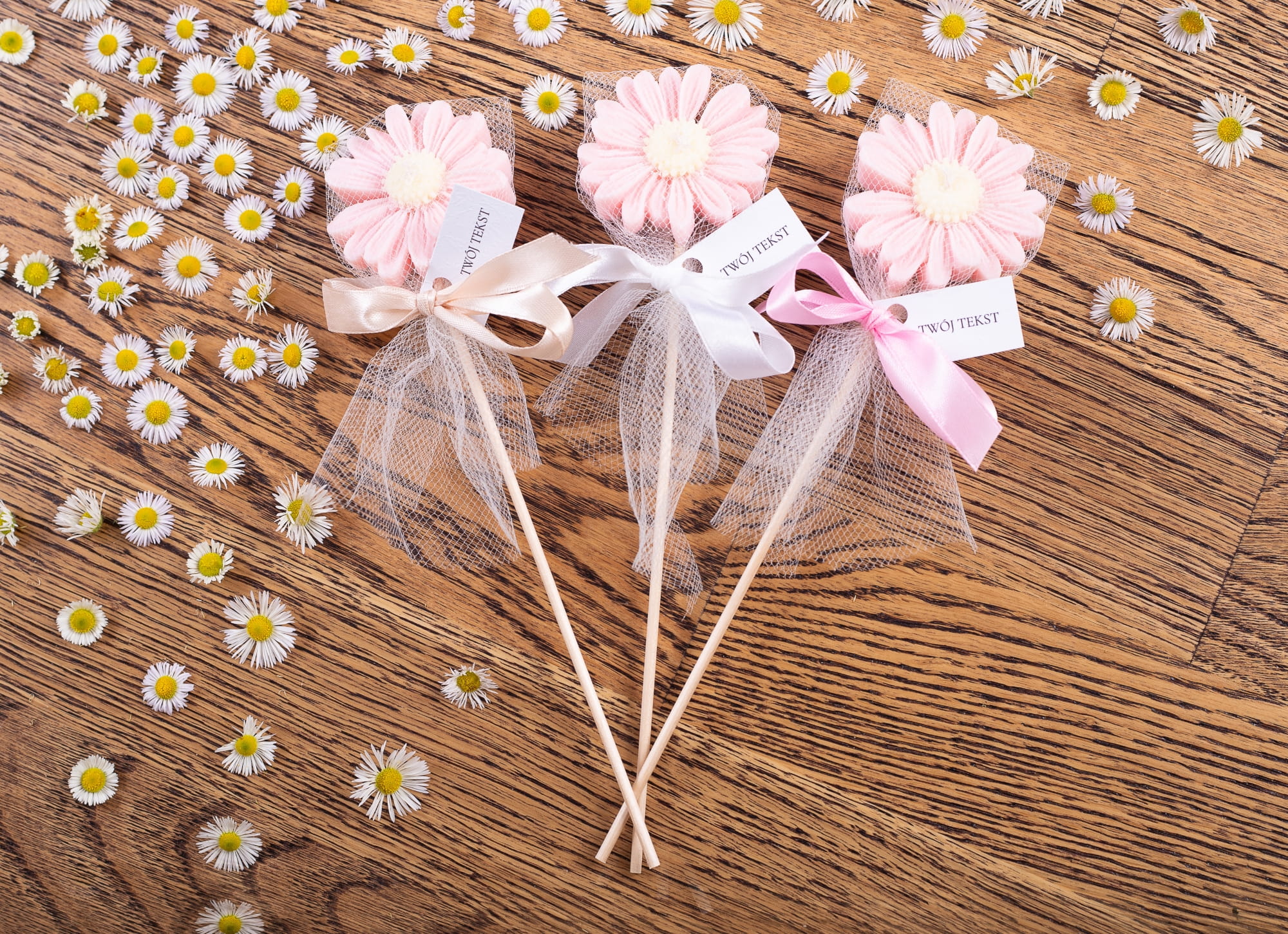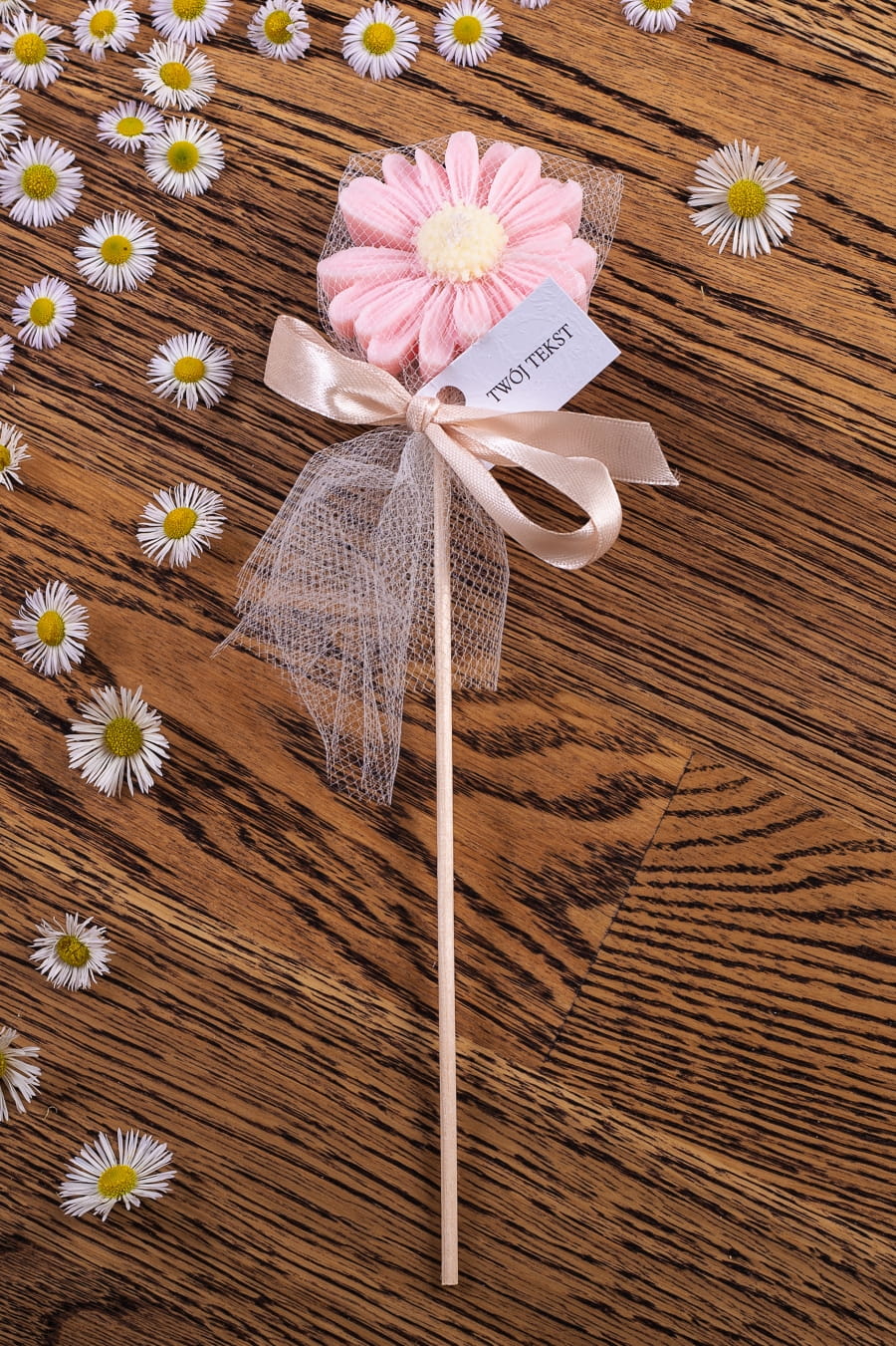 Podziękowania dla gości - różowa stokrotka w tiulu na patyczku