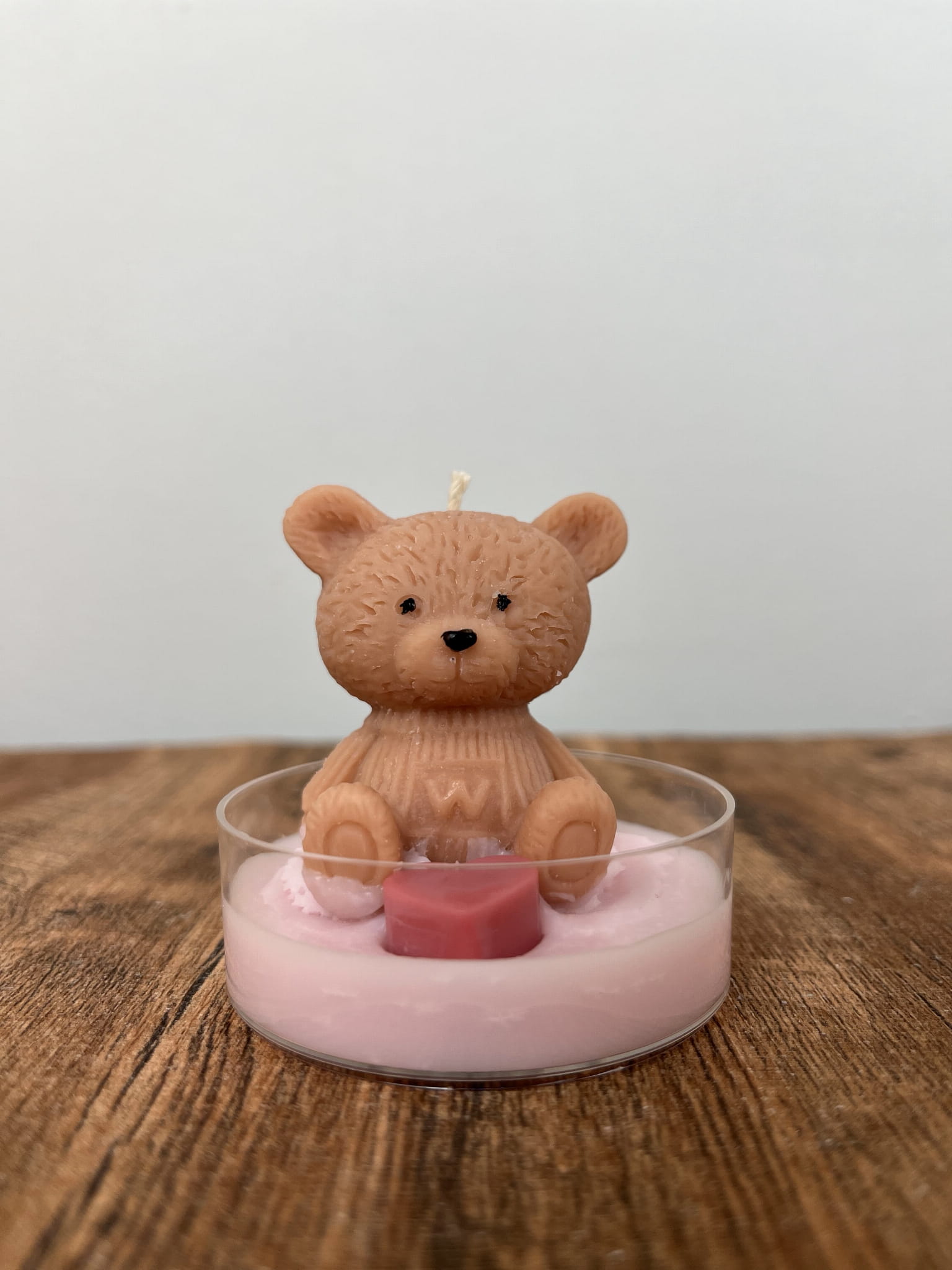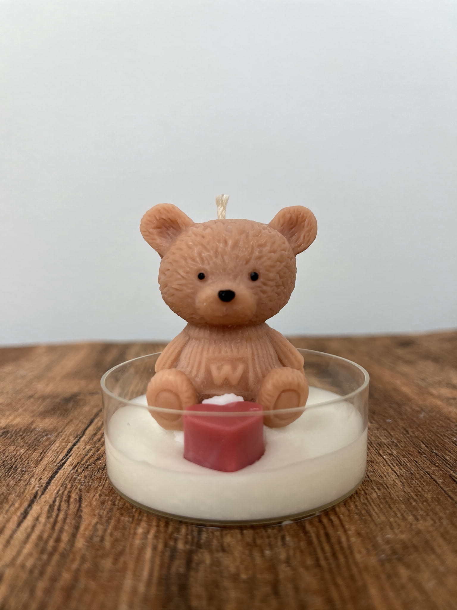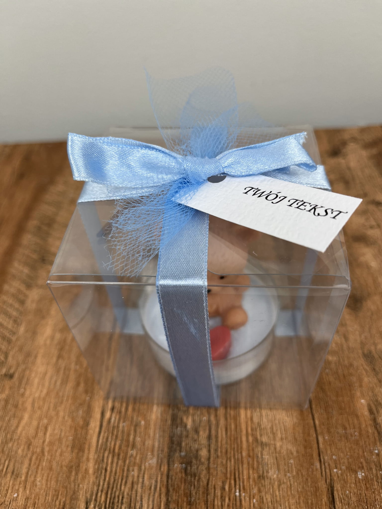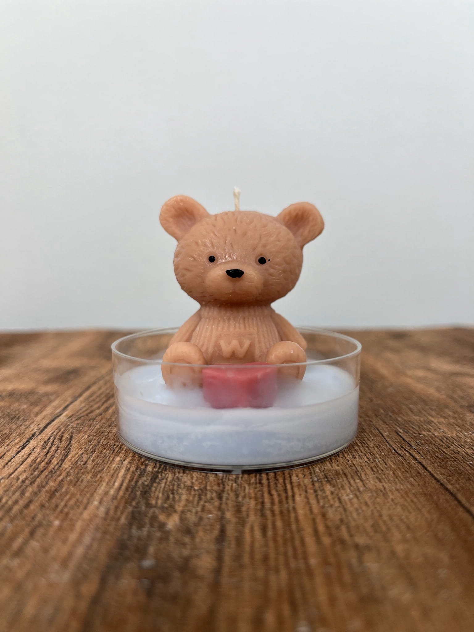 Świeca sojowa dekoracyjna "duży miś" w kolorze brązowym na podstawce w kolorze do wyboru pakowana w pudełko z białą winietką.