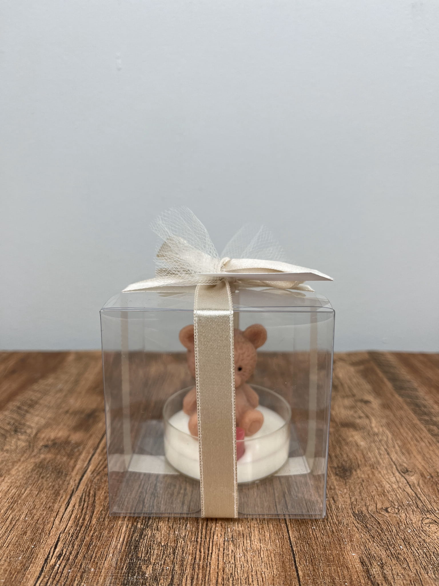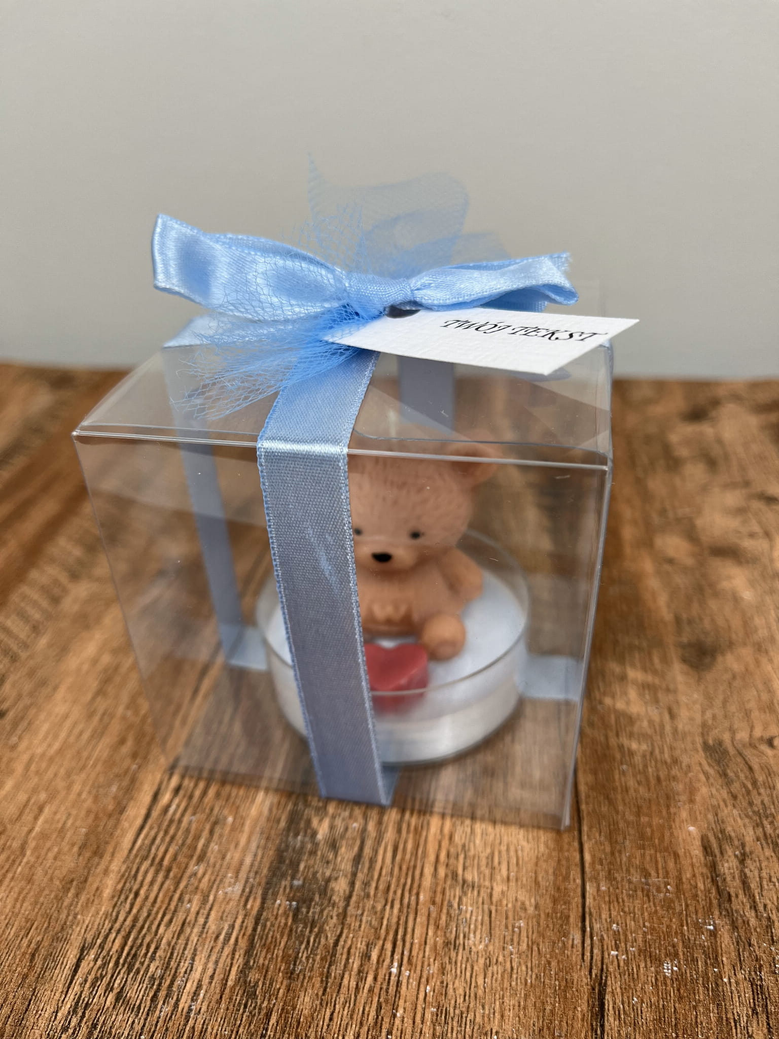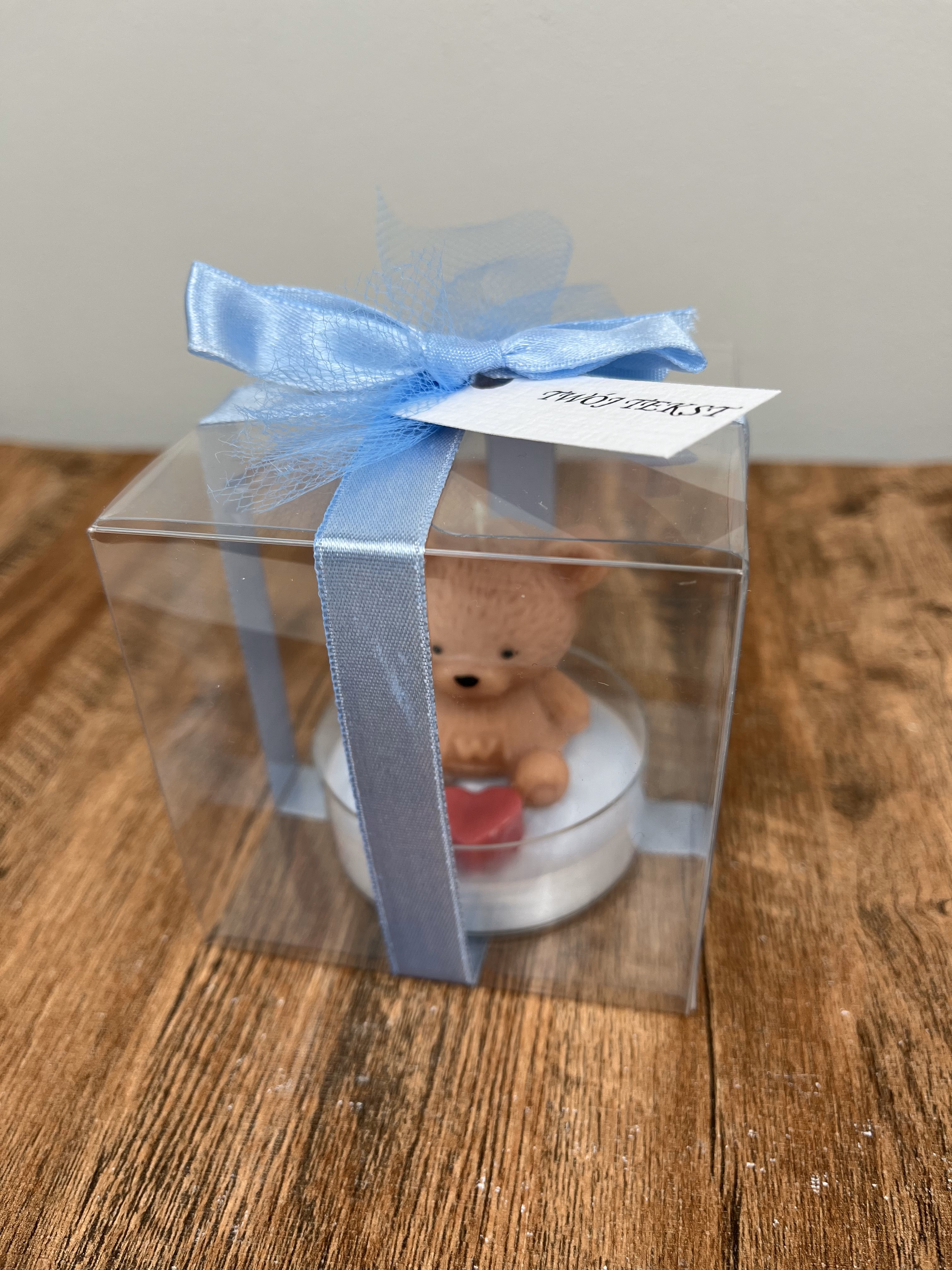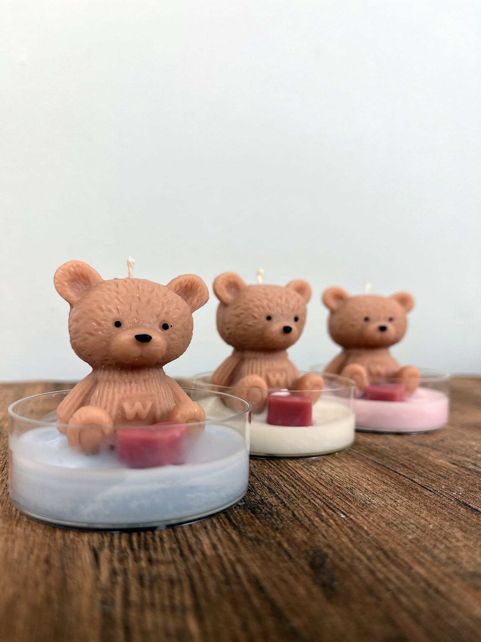 Świeca sojowa dekoracyjna "duży miś" w kolorze brązowym na podstawce w kolorze do wyboru pakowana w pudełko z białą winietką.