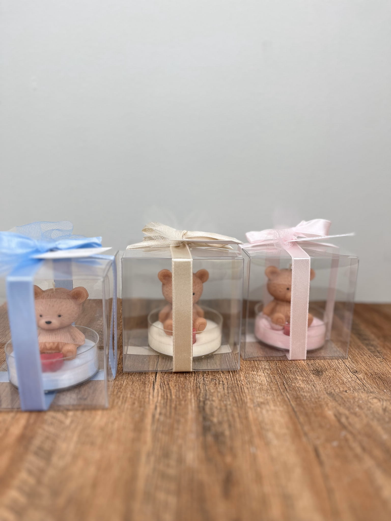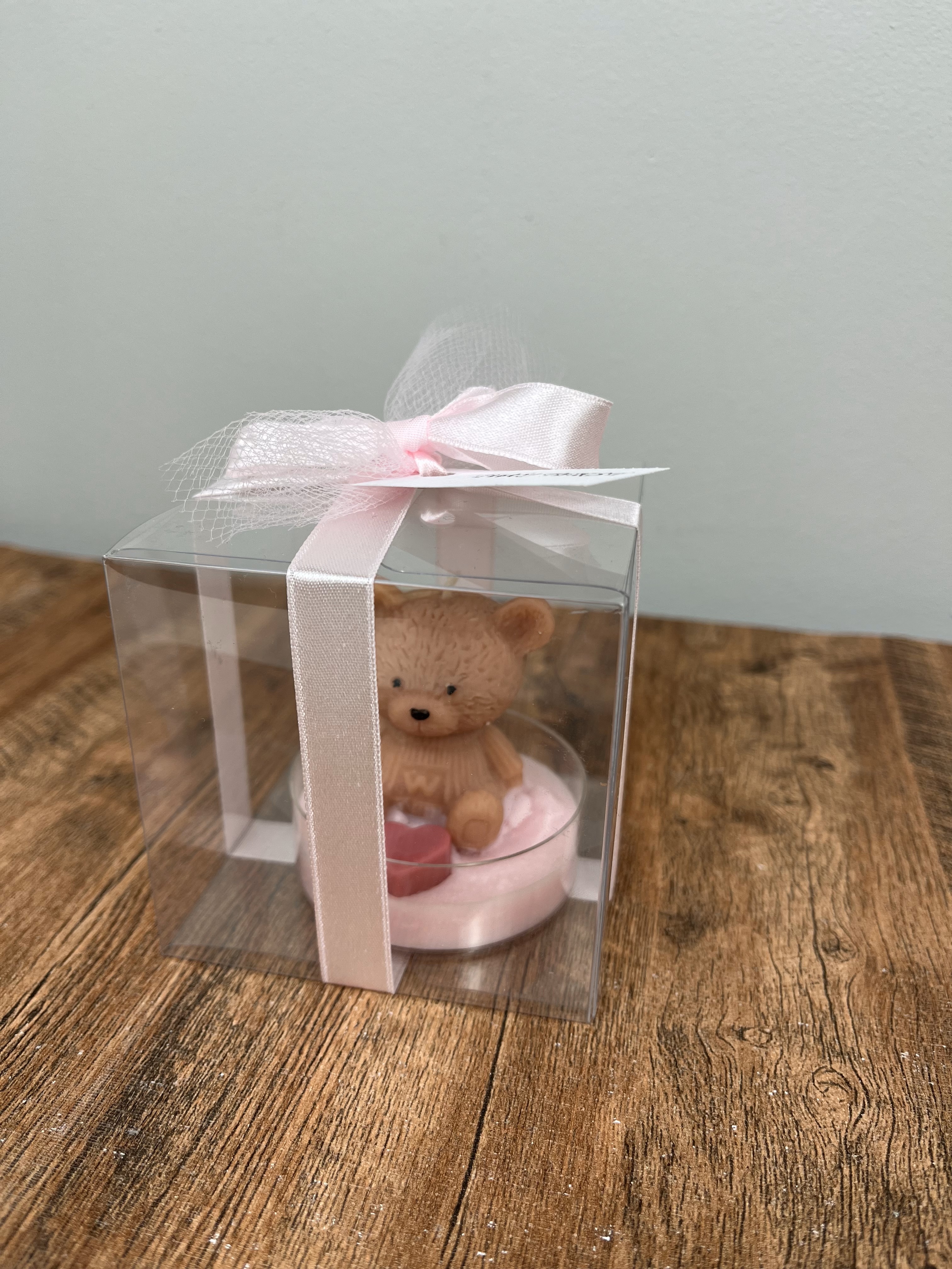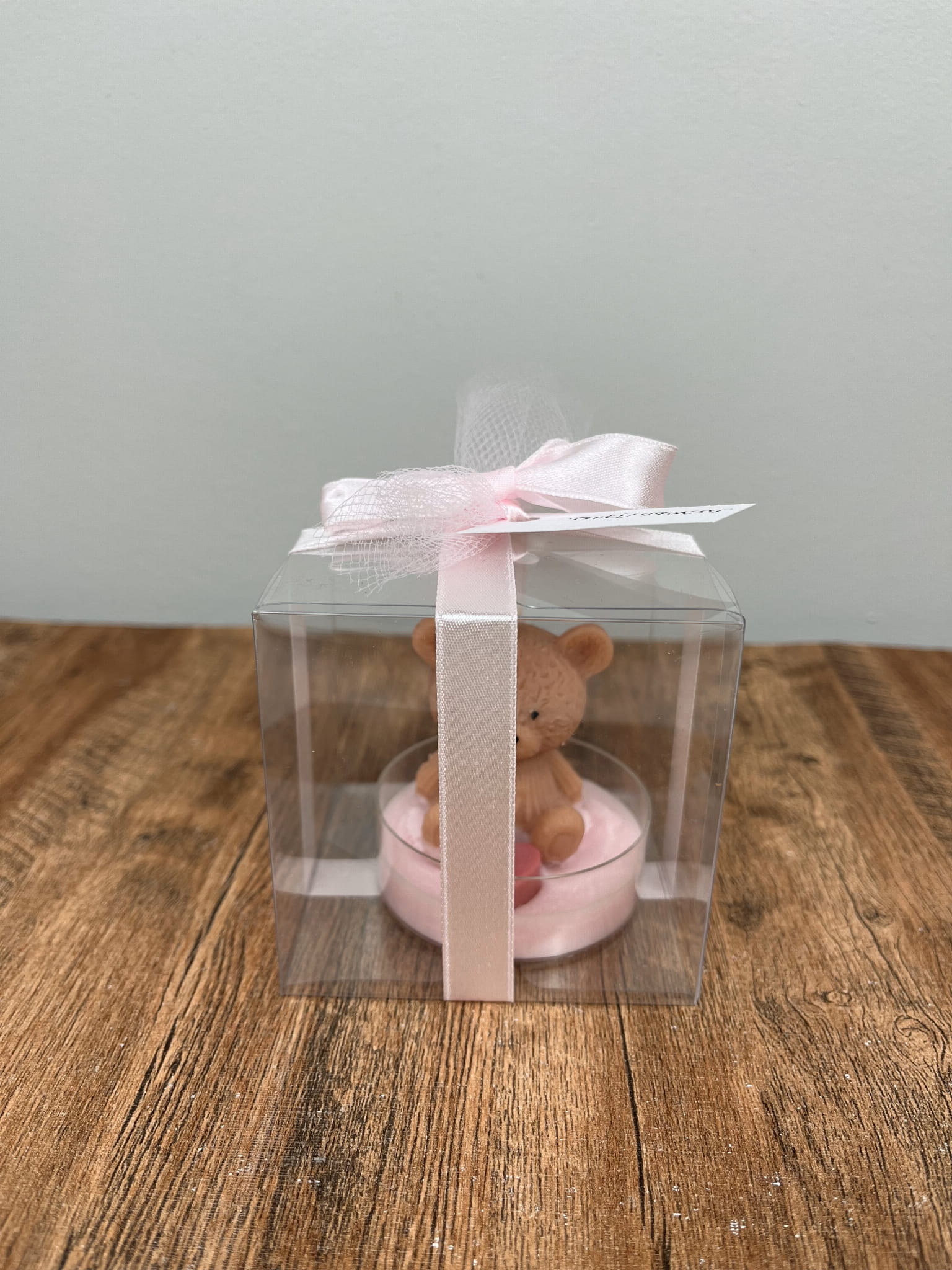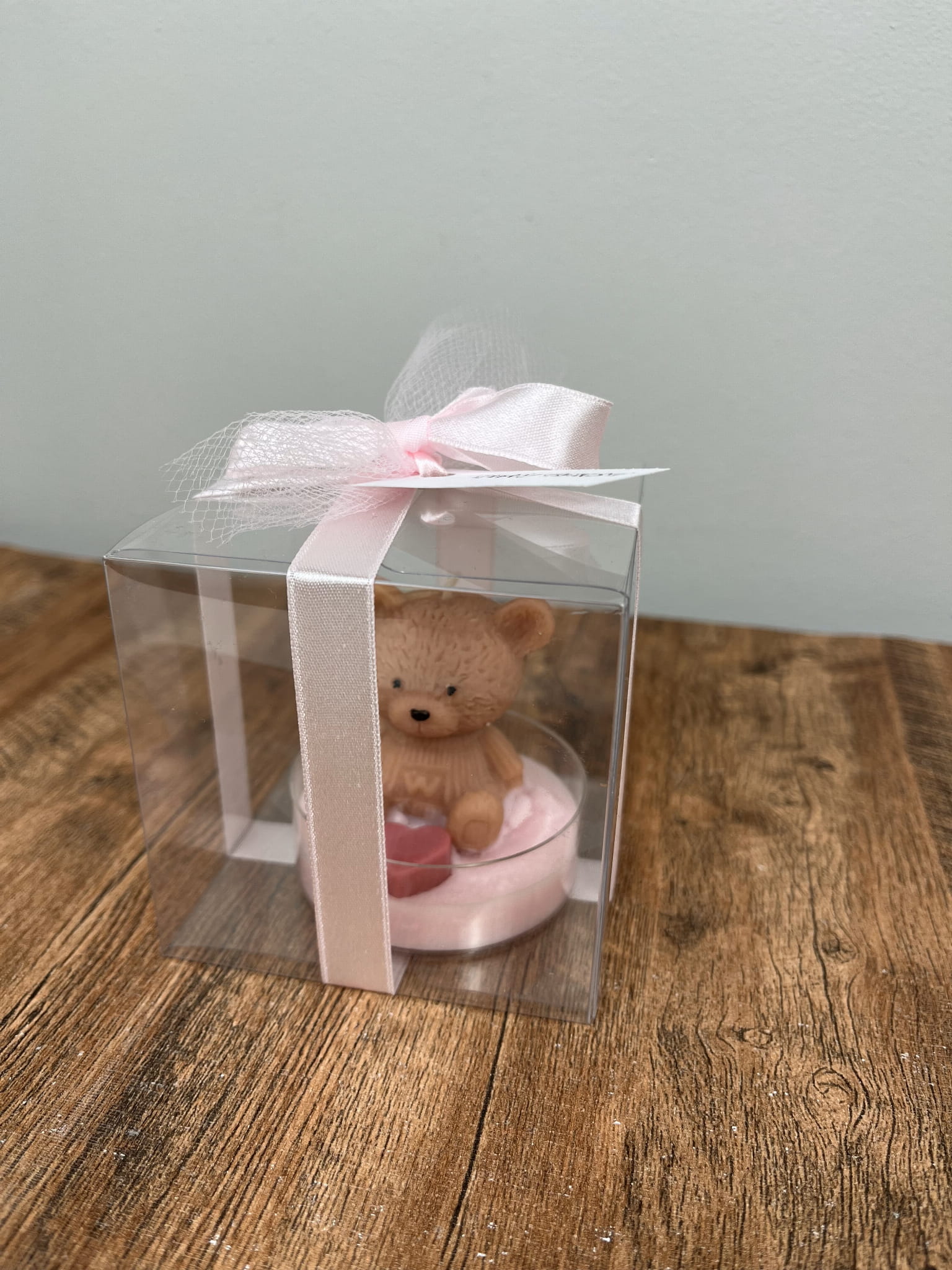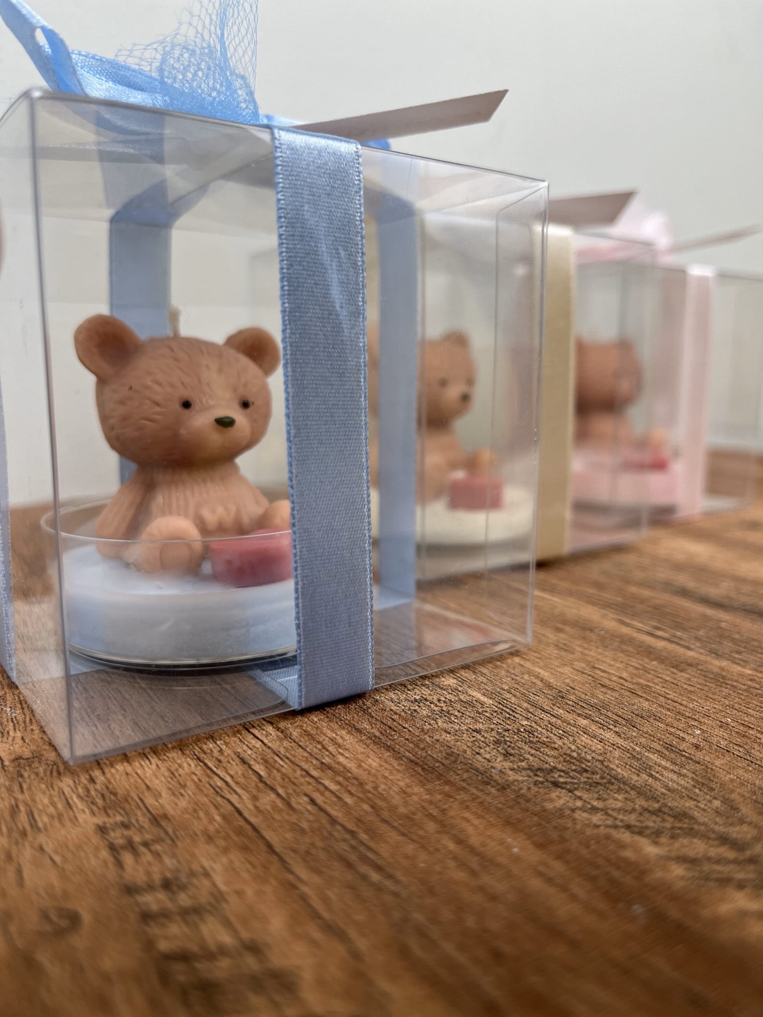 Świeca sojowa dekoracyjna "duży miś" w kolorze brązowym na podstawce w kolorze do wyboru pakowana w pudełko z białą winietką.