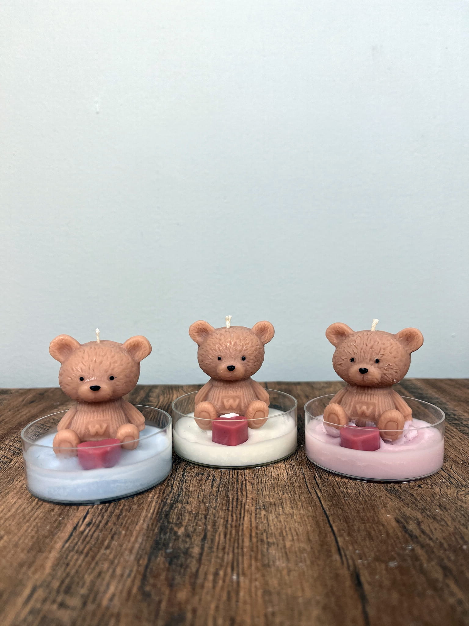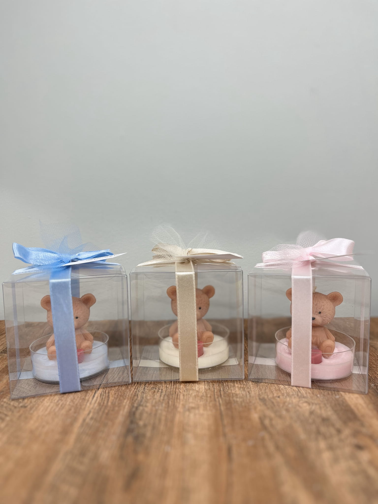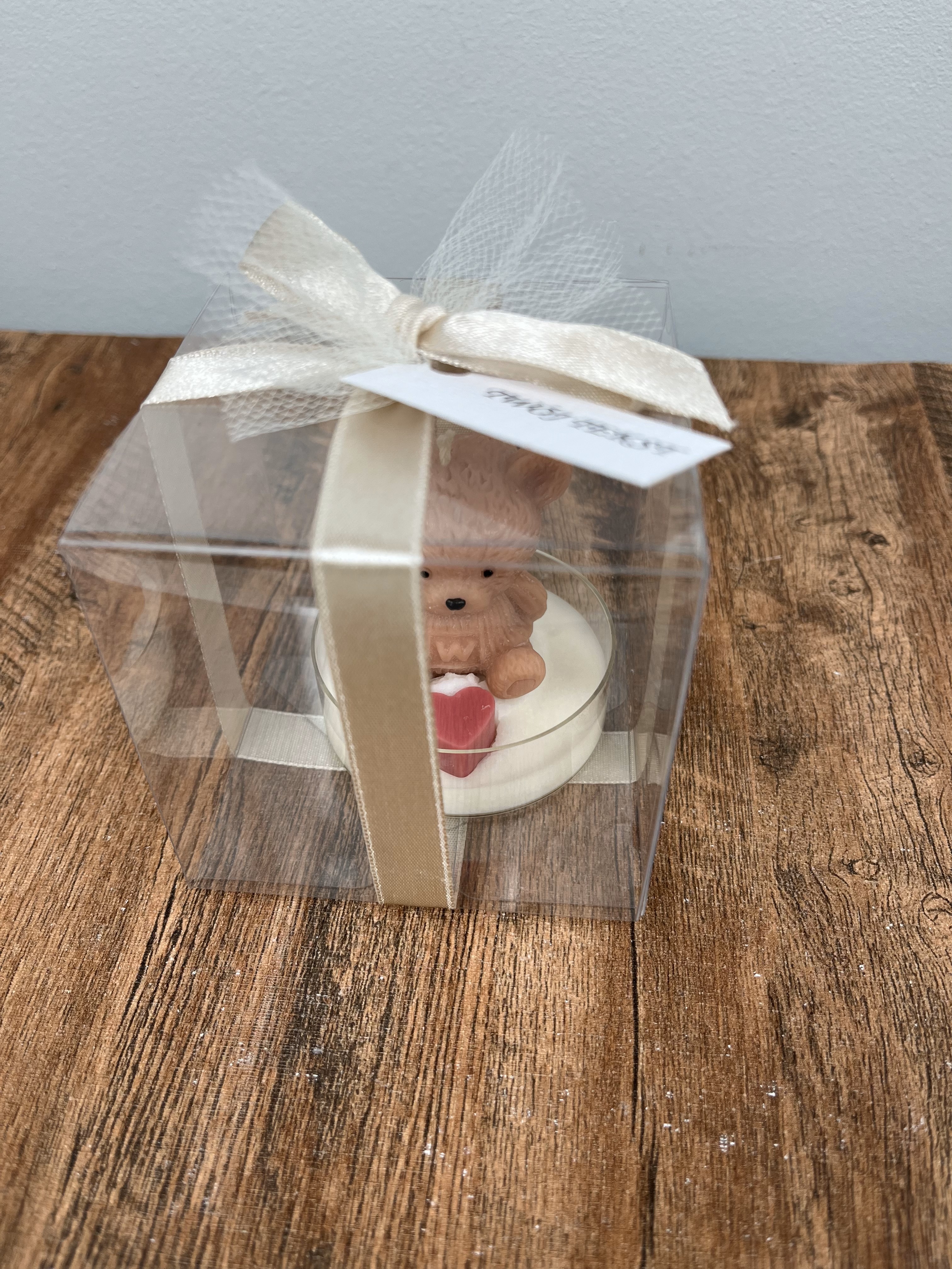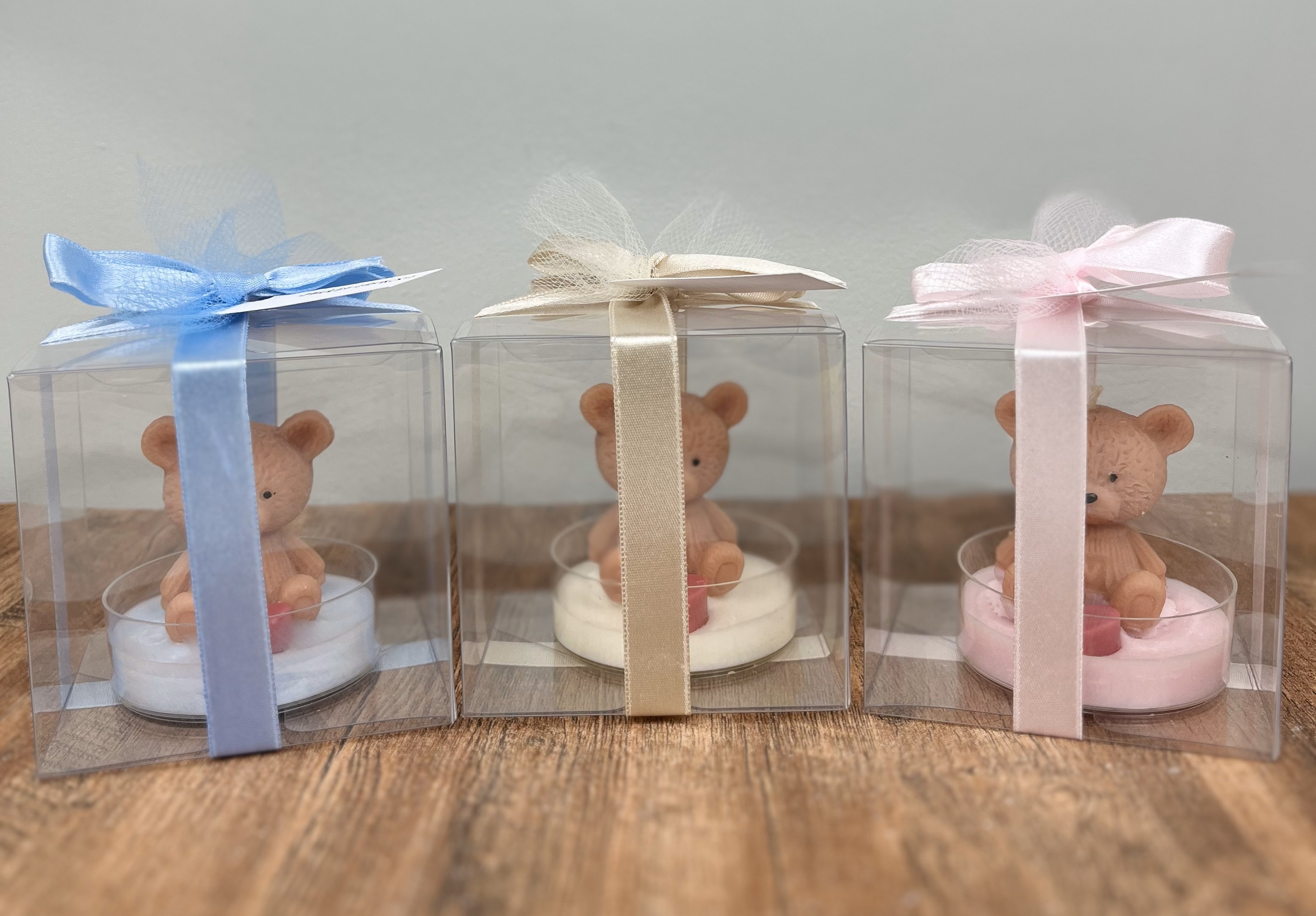 Świeca sojowa dekoracyjna "duży miś" w kolorze brązowym na podstawce w kolorze do wyboru pakowana w pudełko z białą winietką.