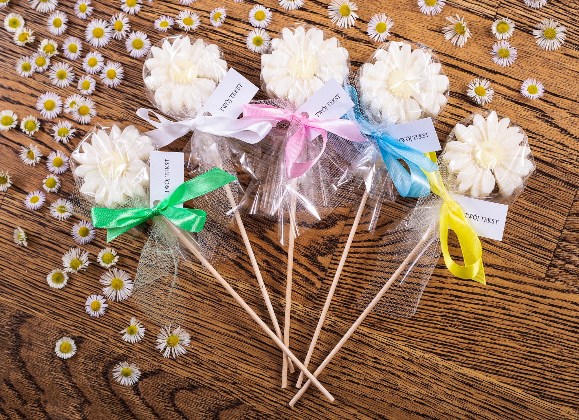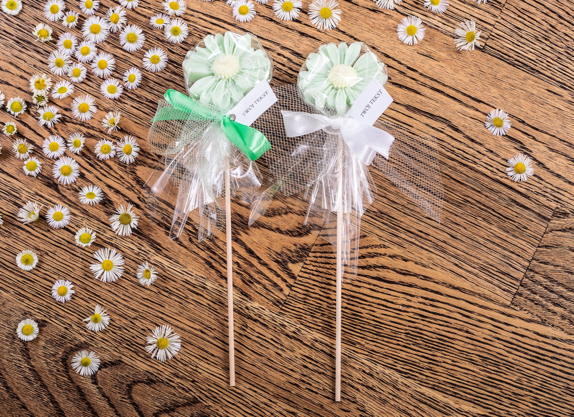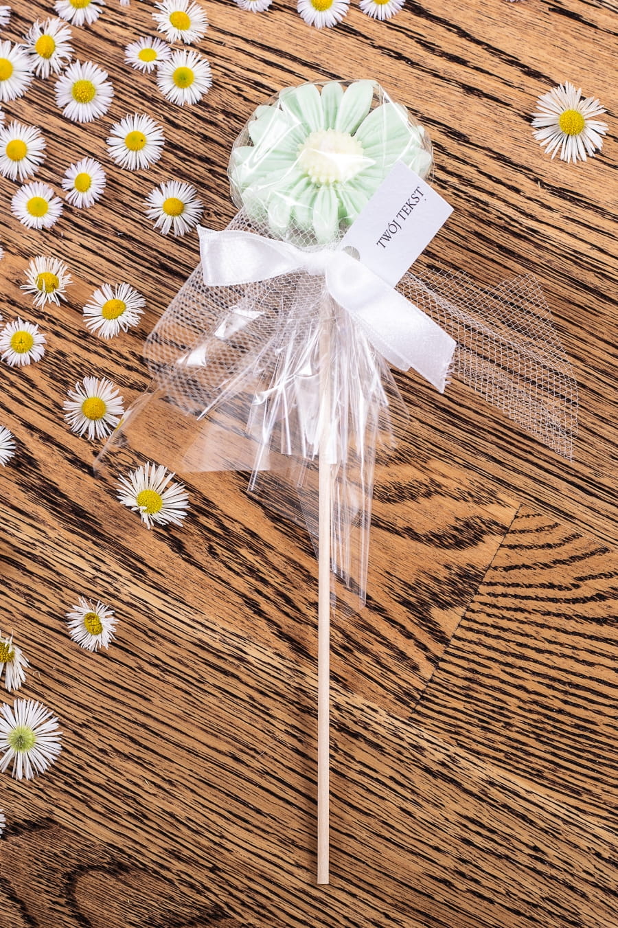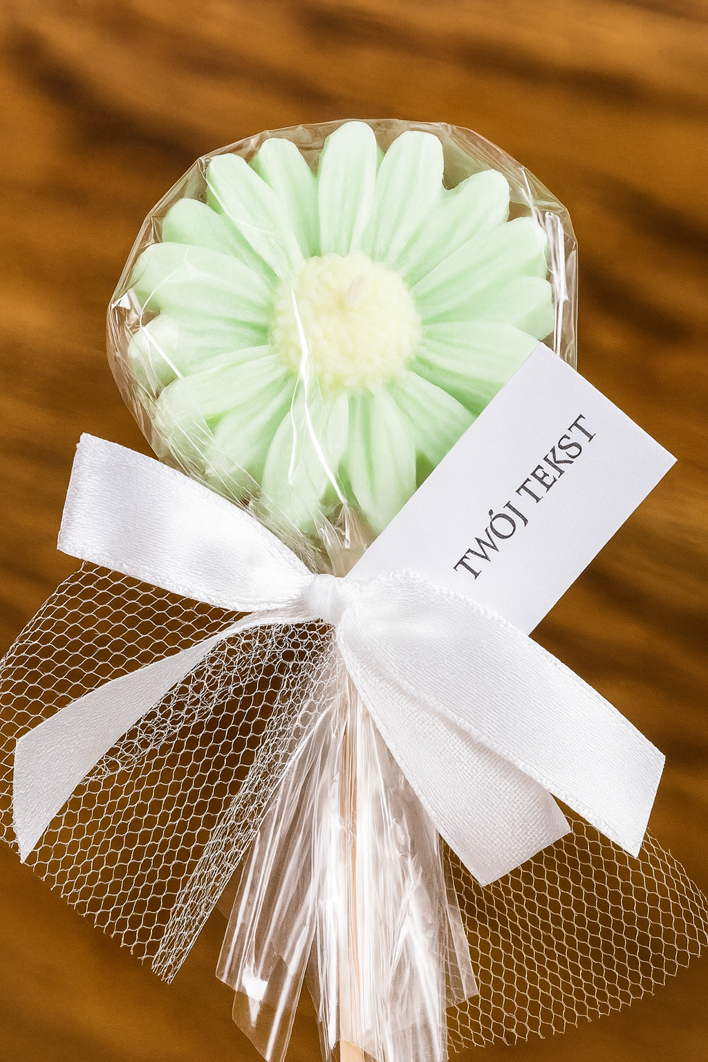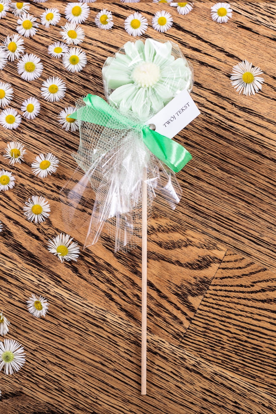 Podziękowania dla gości - zielona stokrotka w celofanie na patyczku