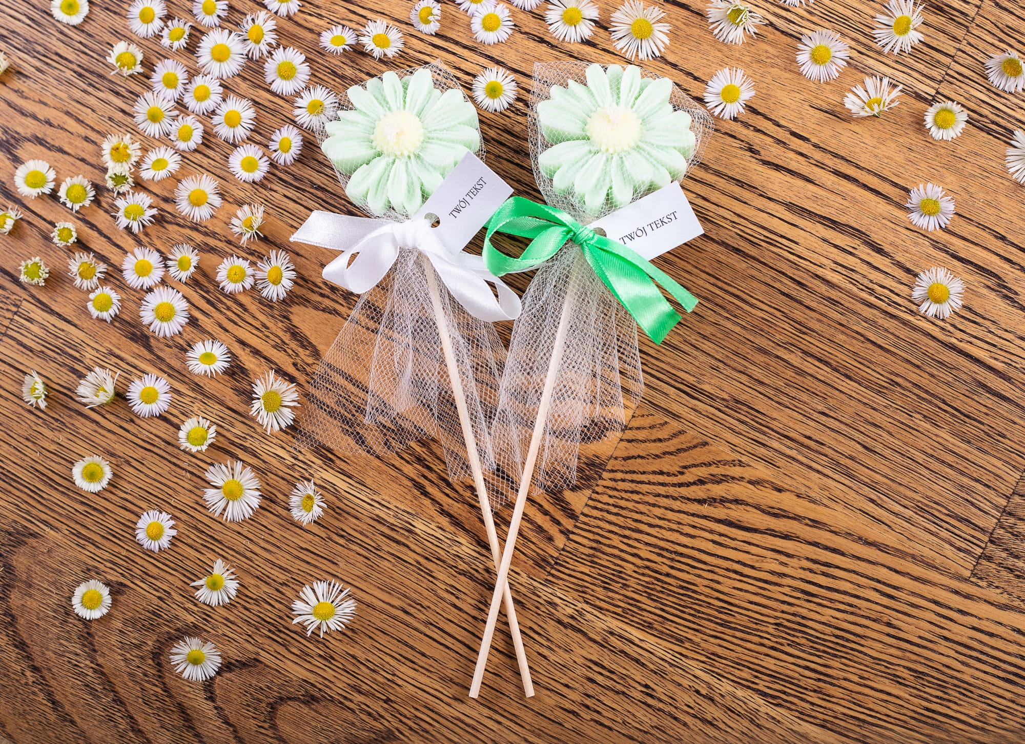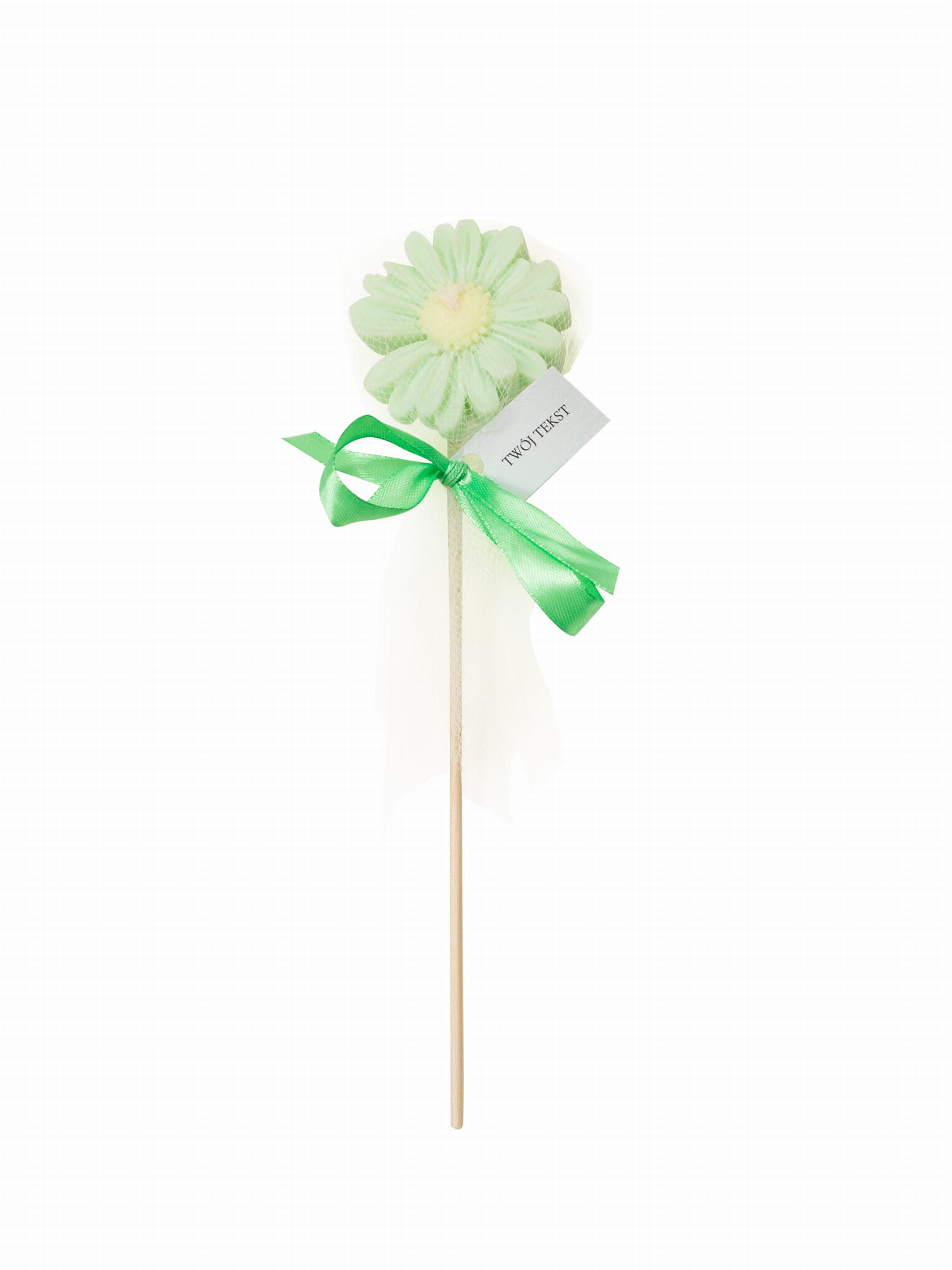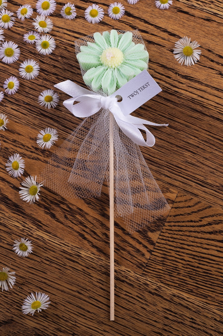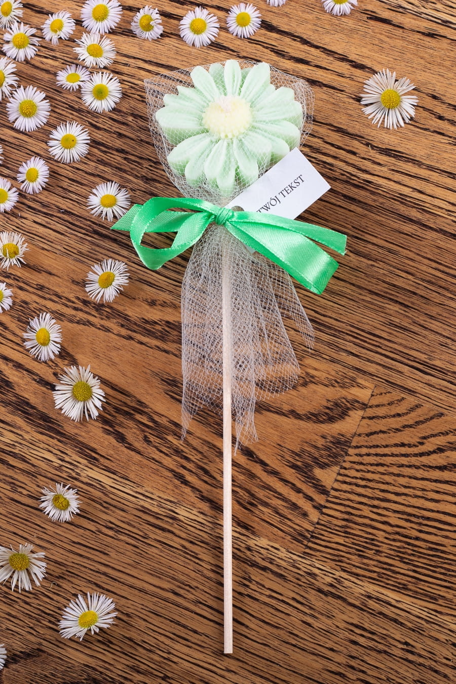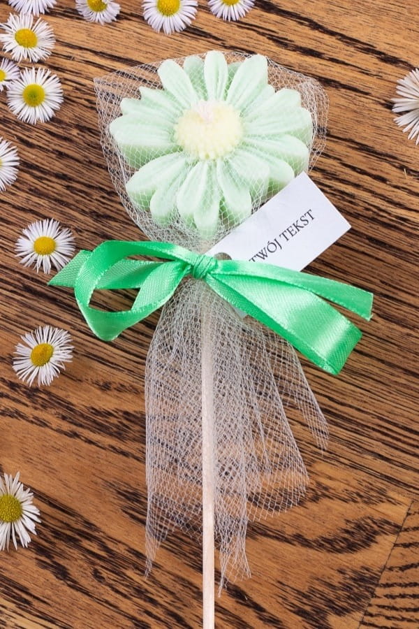 Podziękowania dla gości - zielona stokrotka w tiulu na patyczku